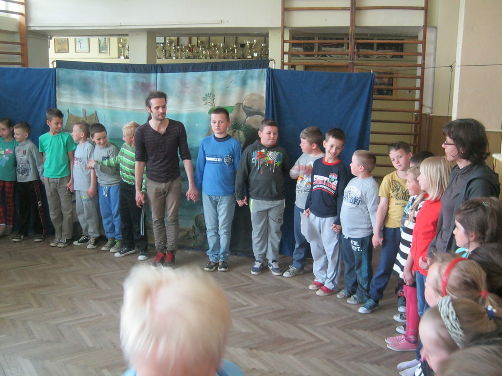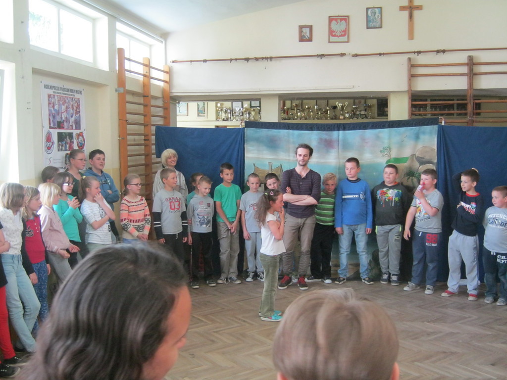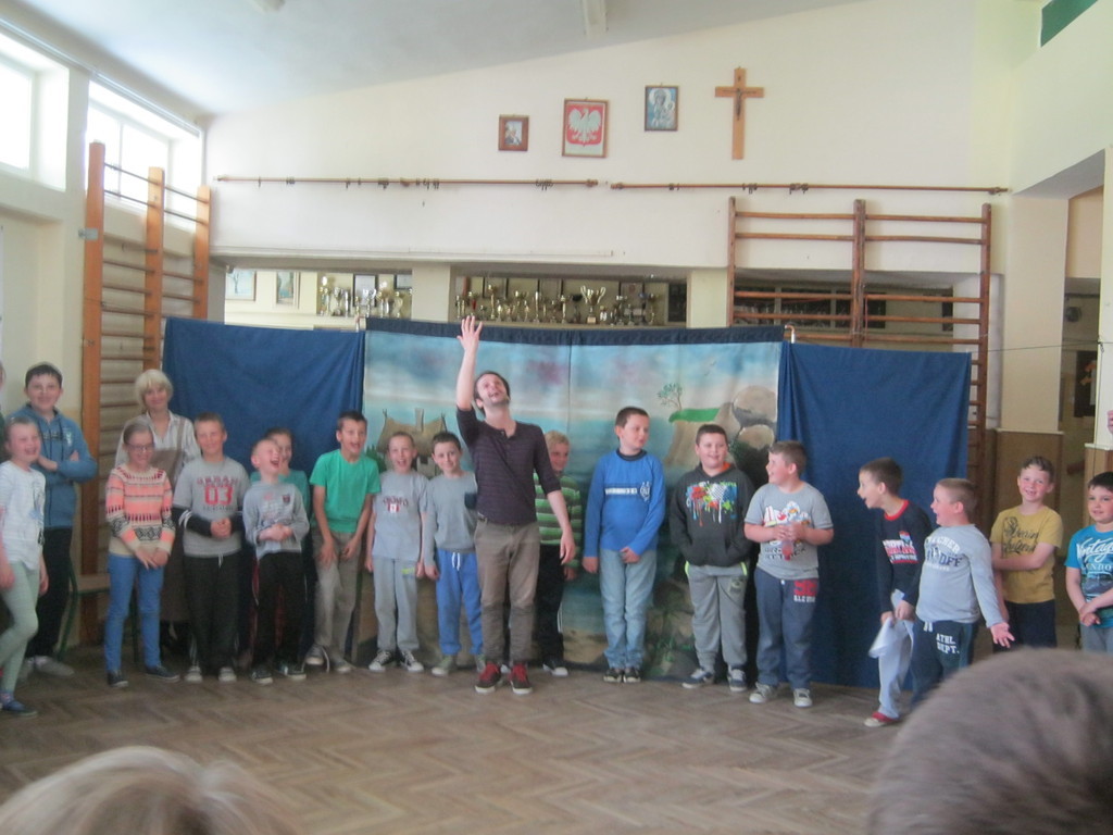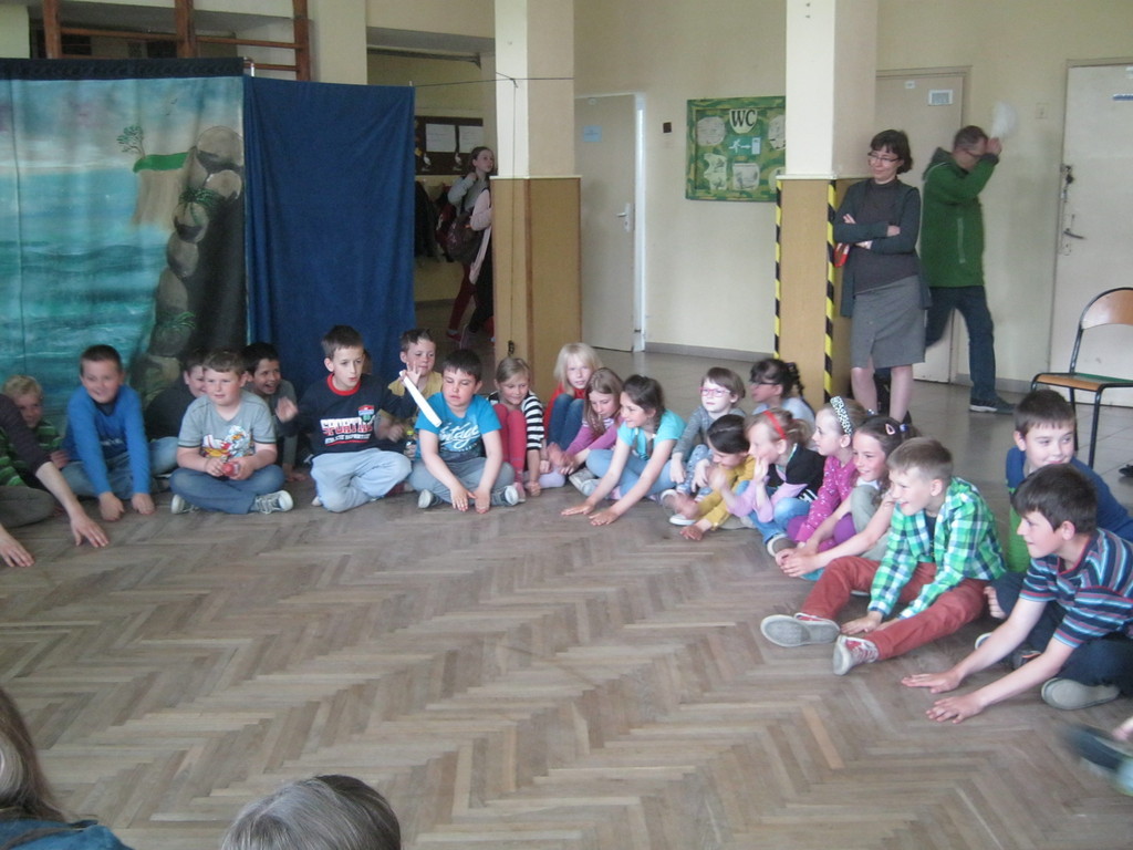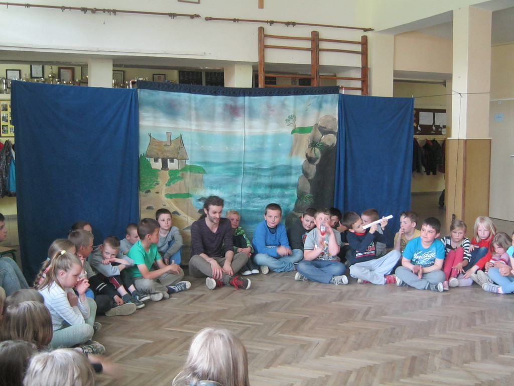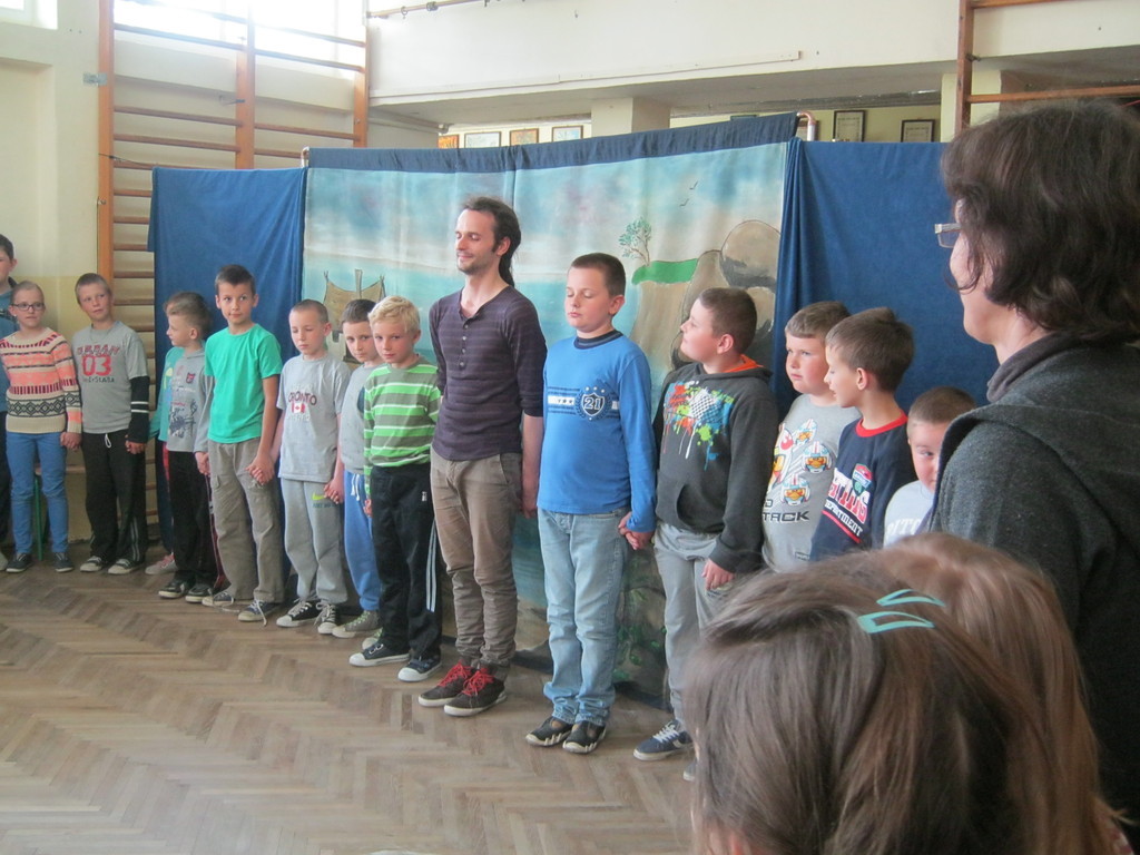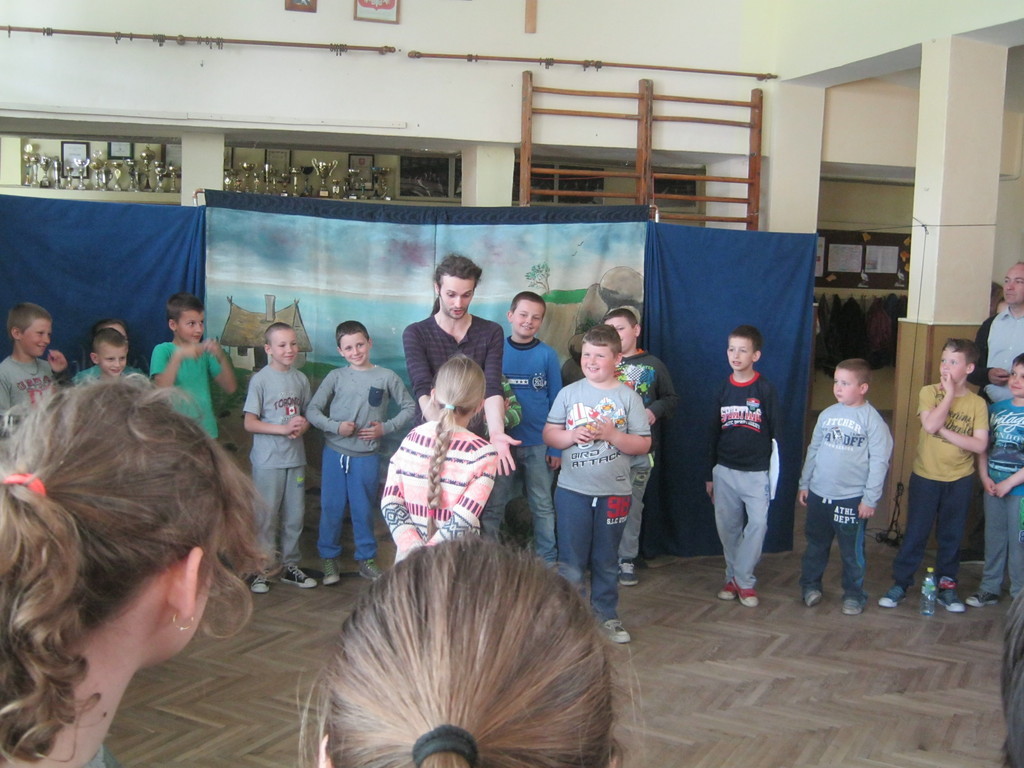 Dnia 27 maja na zaproszenie działającego w Zespole Szkół im. Jana Pawła II w Sątocznie Stowarzyszenia „Animator” przybyli aktorzy z odległego Krakowa, by przybliżyć dzieciom i dorosłym kulturę wysoką, jaką jest teatr. Robili to znakomicie, wykorzystując wszystkie tajniki sztuki aktorskiej, bawiąc się przy tym z oglądającymi przedstawienie dziećmi. Ciekawy temat sztuki (legenda wyjaśniająca pochodzenie soli w morzu), ekspresja wyrazu aktorskiego, prosta, ale wyrazista scenografia oraz interaktywna forma przemówiły do zebranych. Aktorzy zebrali wielkie brawa. Lecz nie koniec na tym. Po krótkiej przerwie zaprosili wszystkie dzieci, nauczycieli i innych dorosłych do udziału w godzinnych warsztatach teatralnych. Ta część spotkania z aktorami teatru ART.-RE okazała się jeszcze bardziej atrakcyjna. Najpierw prowadzący warsztaty aktor – pan Mariusz przybliżył krótko uczestnikom spotkania niektóre pojęcia z teorii teatru, jego odmian, a potem zaczęła się prawdziwa zabawa. Warsztaty ruchowe, mimiczne, słowa, gest sceniczny w wykonaniu uczniów, ale pod okiem i z fachowymi uwagami pana Mariusza. Chętni byli wszyscy. Śmiech, wrzawa, oklaski, radość, zadowolenie – same pozytywne emocje wzbudzał swoimi pomysłami prowadzący warsztaty aktor. Nikt z obecnych także dorosłych, nie pozostał obojętny na dziedzinę sztuki, jaką jest teatr.
