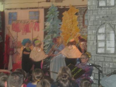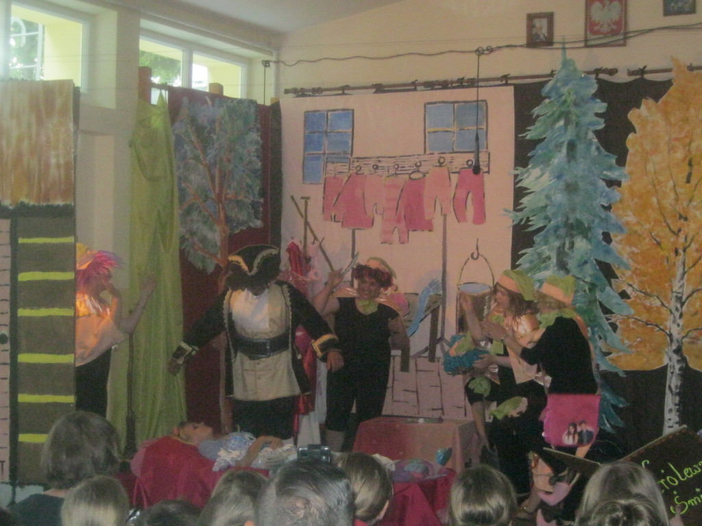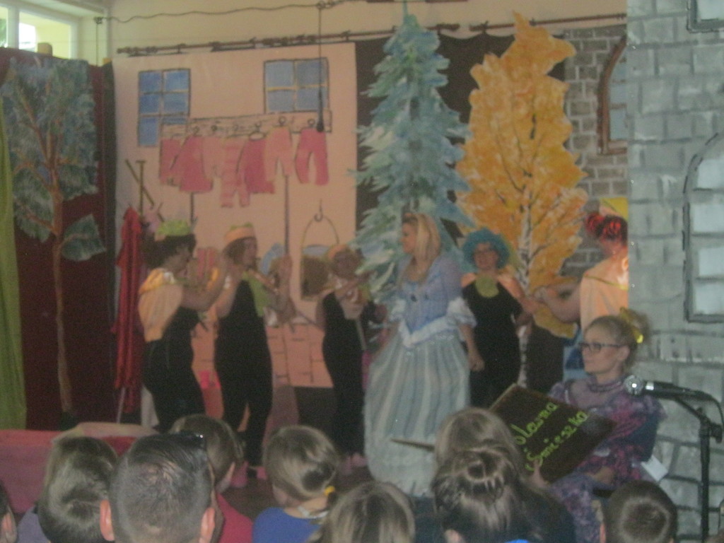 Samych pozytywnych przeżyć dostarczyli tego wieczoru: Danuta Choińska jako królewna Śmieszka, Sylwia Blicharz – babcia, królowa Samo Zło – Urszula Michałko-Czeczeniuk, książę Niewypał – Andrzej Jachowicz, przyjaciel królewny – Piotr Kwiatkowski, sługa królowej – ks. Adam Malak, siedmiu krasnoludków – Mirosława Kaczmarczyk, Mariola Jankowska, Elżbieta Szefer, Joanna Duryło, Joanna Tumowska, Monika Borkowska, Lucyna Zińczuk. Muzykę do spektaklu przygotowała Dorota Wojsko-Kisiel. Piękną scenografię opracowali i wykonali Monika Borkowska i Janusz Bieńkowski ze szkolnym kołem plastycznym. Reżyserzy przedstawienia to Dorota Wojsko-Kisiel i Danuta Bieńkowska.