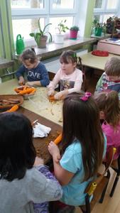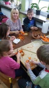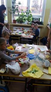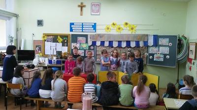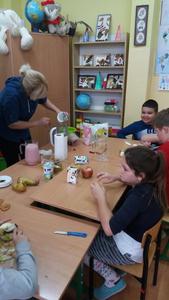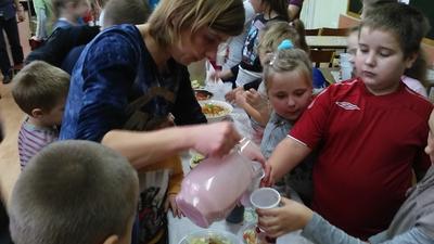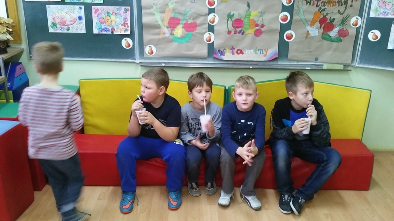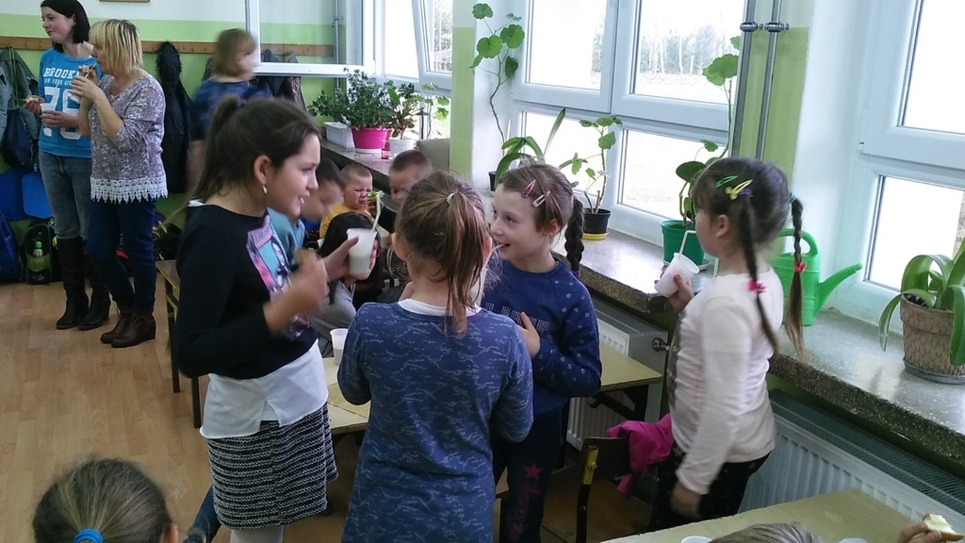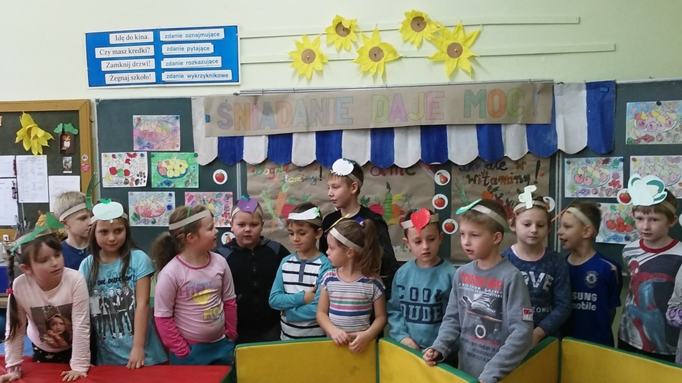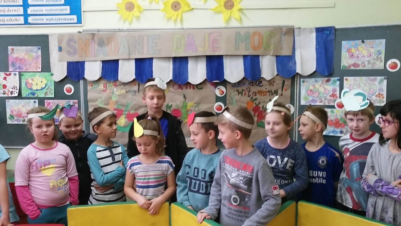 A wszystko dzięki bardzo mądrej ogólnopolskiej akcji pod nazwą Dzień Śniadanie Daje Moc organizowanej 8 listopada już od sześciu lat. W 2007 roku 8 listopada został ogłoszony Europejskim Dniem Zdrowego Jedzenia i Gotowania przez ówczesnego Komisarza ds. Zdrowia. Najważniejsze cele programu pozostają niezmienne: zwiększanie świadomości nt. zdrowego odżywiania i roli śniadania w diecie dziecka oraz przyczynianie się do obniżania poziomu niedożywienia dzieci w Polsce – poprzez edukację i promocję prawidłowego żywienia. Dzięki takiej akcji, która okazuje się być jednocześnie świetną zabawą zarówno dla dzieci, jak i dla dorosłych, najmłodsi uczą się, jak ważne jest codzienne, zdrowe śniadanie. Wszelkie programy przypominające o tym mają sens, gdyż statystyki pozostają wciąż niezadowalające. Mnóstwo dzieci wychodzi z domu bez śniadania, niezaopatrzone w drugie. Wiele nie spożywa go nawet kilka razy w tygodniu. A przecież pomaga ono dobrze zacząć dzień i daje równy start w szkolne obowiązki. Wszystkim zależy, aby dzieci były zdrowe i miały energię do nauki i zabawy. Stąd pomysł na udział w Dniu Śniadanie Daje Moc przez naszą szkołę, a dokładnie – udział klas I – III SP. Dzieci w swoich klasach wspólnie z rodzicami i wychowawczyniami przygotowały zdrowe śniadanie. Wcześniej przyniosły zdrowe produkty i sprzęt do pracy. Pojawiło się więc pieczywo razowe i pełnoziarniste, a także naturalne jogurty, mandarynki, banany, pomidory, ogórki, jabłka, marchewki i inne owoce oraz warzywa. Poszły w ruch miksery i dziesiątki małych rąk do pomocy. Klasa I specjalizowała się w kolorowych kanapkach, kl. II – w surówkach, kl. III – w koktajlach owocowo – jogurtowych. Efekt fantastyczny, że ślinka cieknie! Zanim jednak doszło do wspólnej konsumpcji, wszystkie wytwory rąk własnych ustawiono na kolorowych stołach w pięknie udekorowanej klasie II. Dzieci wzięły udział w pogadance na temat zdrowego odżywiania. Uczniowie kl. II przedstawili inscenizację wiersza J. Brzechwy pt. „Na straganie”, a kl. I wykonała piosenki jesienne. Teraz można było zjeść wartościowe śniadanie, które daje moc. Wśród śmiechów i żartów wszyscy konsumowali przygotowane wspólnie kanapki, sałatki, surówki, pili kolorowe koktajle. Było cudownie! Dzieciom towarzyszyły rysunki i plakaty wykonane przez nie wcześniej, obrazujące soczyste, zdrowe warzywa, owoce i inne składniki oraz zasady prawidłowego odżywiania. Takie śniadanie dało dzieciom moc do udziału w konkursach i zagadkach poświęconych zdrowemu odżywianiu się. Nagrodami były kolorowanki. Po śniadaniu uczniowie i rodzice przystąpili do sprzątania. Pozostałym posiłkiem poczęstowali innych uczniów naszej szkoły.