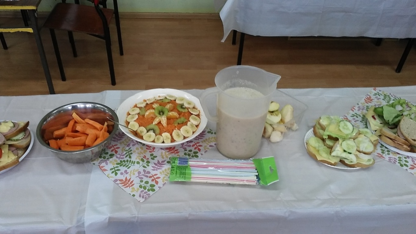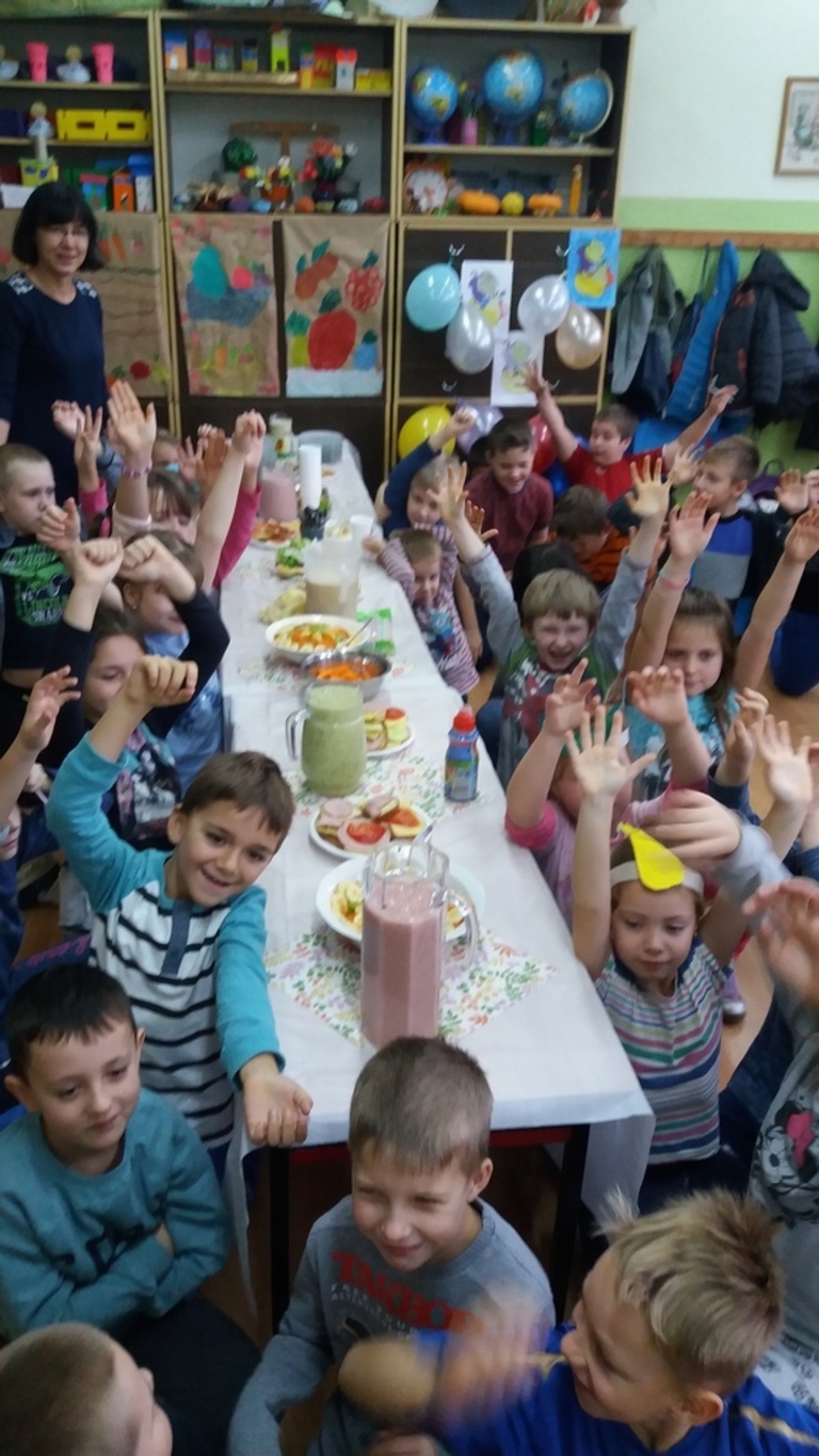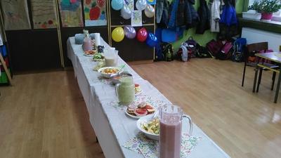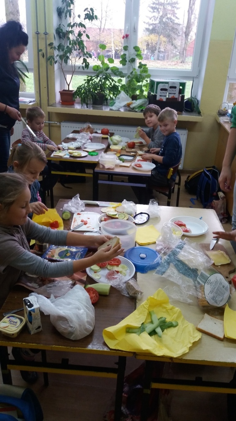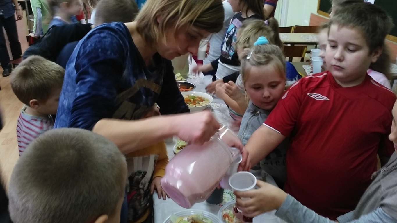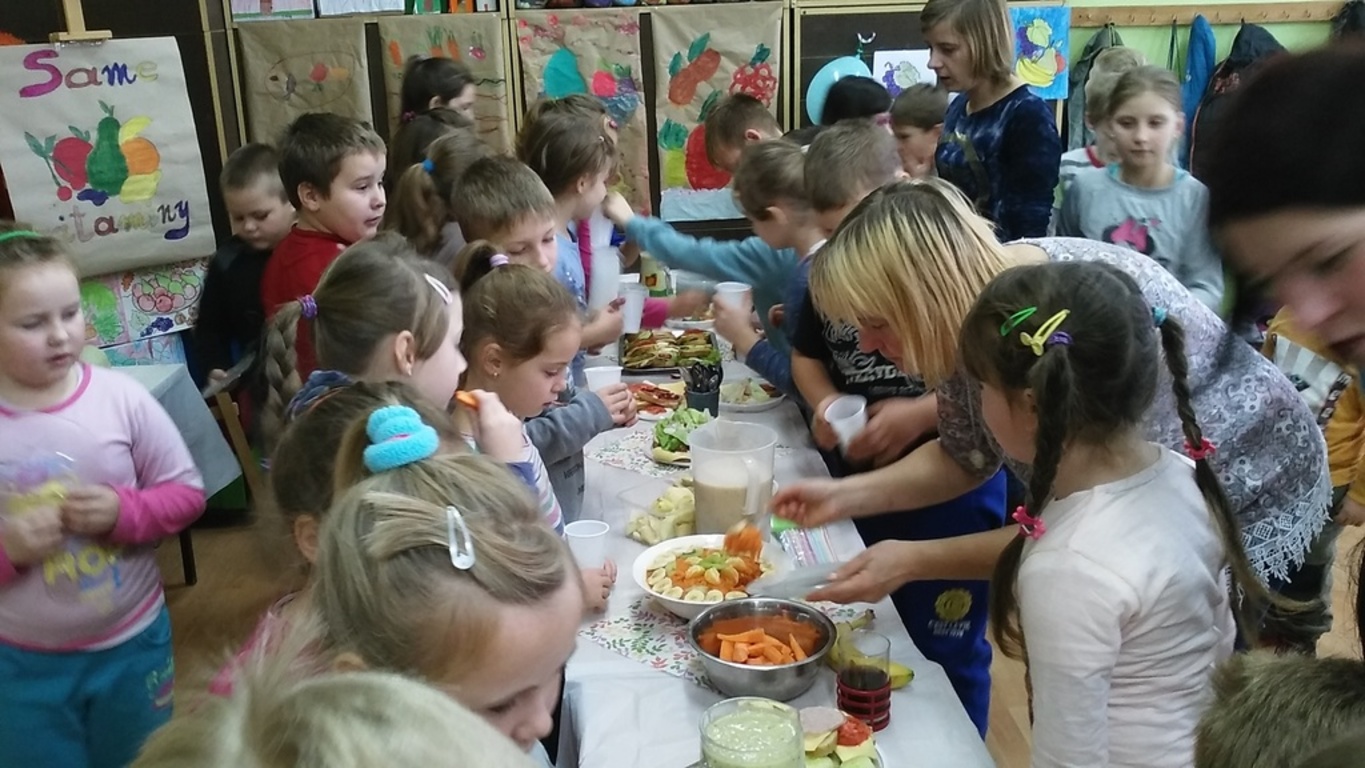 Mieniące się kolorami, fantastycznie smakowite, bogato i estetycznie wyglądające stoły zastawione barwnymi kanapkami, surówkami, koktajlami, owocami i warzywami można było dzisiaj obejrzeć w klasie II Szkoły Podstawowej w Sątocznie. Sala ta jawiła się jak niezwykła, bajeczna wyspa na szerokim oceanie szkoły. Wokół stołów radosne maluchy z klas I – III SP, ich roześmiane mamy i zadowolone z efektu wspólnej pracy nauczycielki – wychowawczynie klasy I – p. Dorota Sańko i klasy II – p. Elżbieta Szefer oraz w zastępstwie – p. Joanna Duryło i p. Joanna Tumowska.