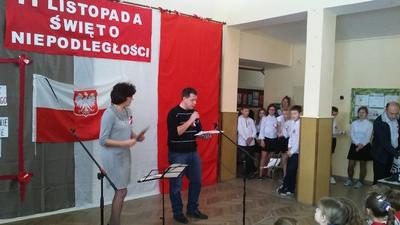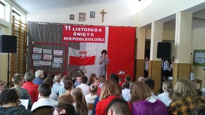 W wyjątkowej ciszy i powadze odbyła się w naszej szkole 10 listopada uroczystość upamiętniająca odzyskanie przez Polskę niepodległości. Młodsi i starsi uczniowie z należytym szacunkiem zaśpiewali hymn narodowy, gdy na scenę wkroczył poczet sztandarowy. Potem obejrzeli stosowną inscenizację w wykonaniu uczniów klasy VI SP.