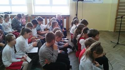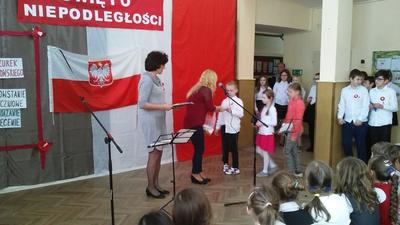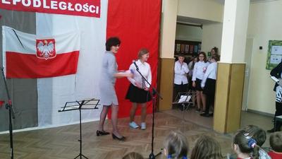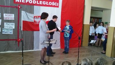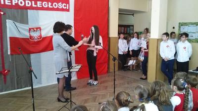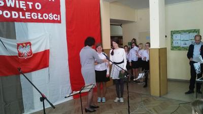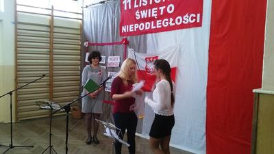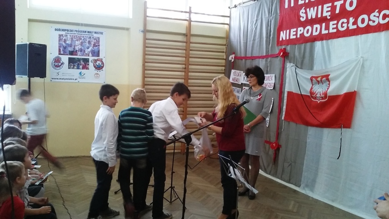 Po akademii nauczyciele wręczali nagrody w różnych konkursach, które odbyły się wcześniej: ekologicznym (znów mamy sukces rangi regionalnej w konkursie dla gimnazjalistów organizowanym przez Fundację Wielkich Jezior Mazurskich dzięki zaangażowaniu pani Krystyny Zajdel oraz uczennic: Zuzi Łuszczak, Dominiki Tracewicz i Mileny Adamowicz!), czytelniczym, matematycznym. Atmosfera świętowania była więc bardzo miła. Dziękujemy panu Andrzejowi Jachowiczowi – wychowawcy klasy VI i uczniom za przygotowanie pięknego apelu, który w komunikatywny sposób opowiedział o trudnej drodze Polski i Polaków do niepodległości.