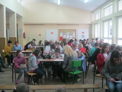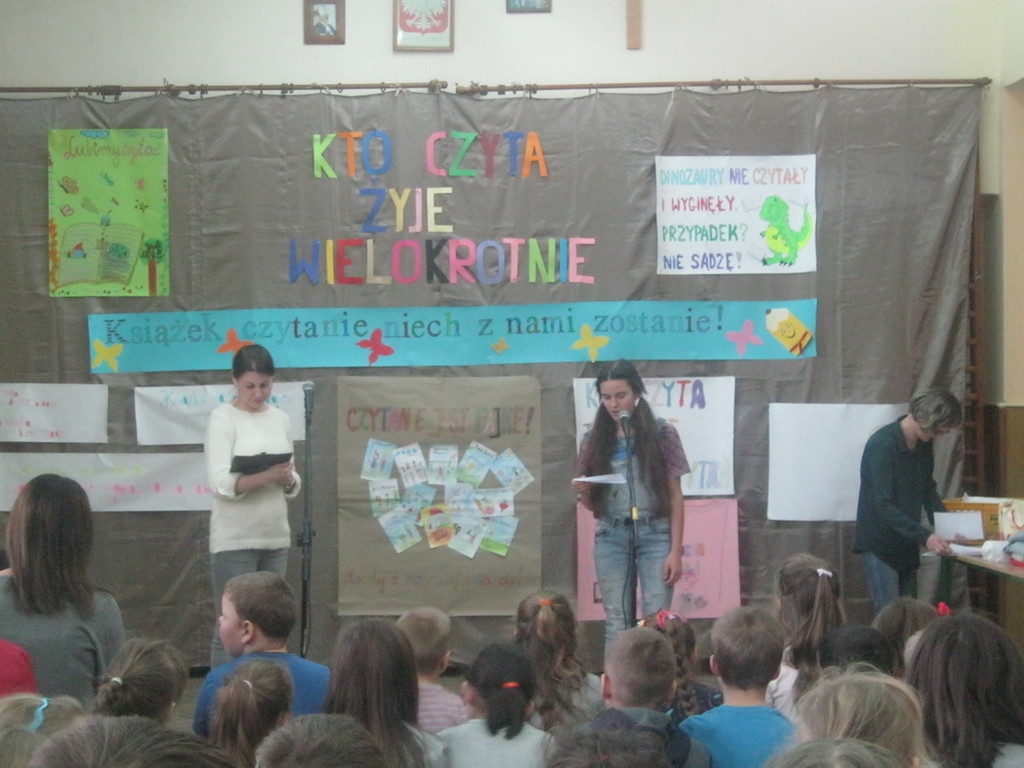 Pod honorowym patronatem pani dyrektor Teresy Pupin i Samorządu Uczniowskiego z przewodniczącą Gabrysią Stróg odbył się godzinny konkurs promujący czytelnictwo, zorganizowany przez nauczycielki j. polskiego – Dorotę Wojszko – Kisiel i Danutę Bieńkowską. Klasy pracowały w grupach z wychowawcami, czytając krótkie teksty, które otrzymał każdy uczeń. Następnie przedstawiciel prezentował fragment głośno przed całą szkołą. Wreszcie klasa otrzymywała od prowadzących 1 – 2 pytania związane z przeczytanym tekstem. Za poprawne odpowiedzi cały zespół był nagradzany słodyczami. Sprawnym, pięknym czytaniem oraz poprawnymi odpowiedziami mogli pochwalić się również nauczyciele oraz pracownicy obsługi szkoły, którzy stanowili oddzielne drużyny. W ten sposób cała szkoła uczestniczyła w zbiorowym czytaniu literatury pięknej. Na koniec przedstawicielka SU oceniła hasła promujące czytelnictwo, przygotowane wcześniej przez wszystkie klasy i wyeksponowane na holu. Były kolorowe i pomysłowe. Najciekawsze okazały się prace klas: III gimnazjum, II SP i V SP.