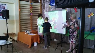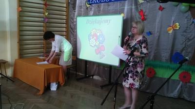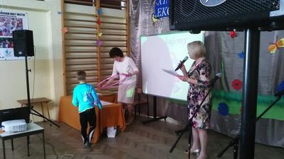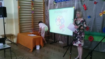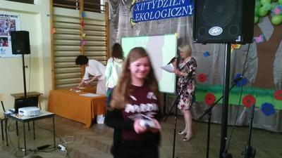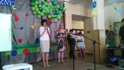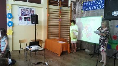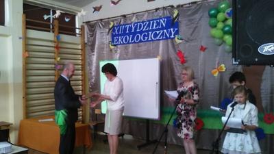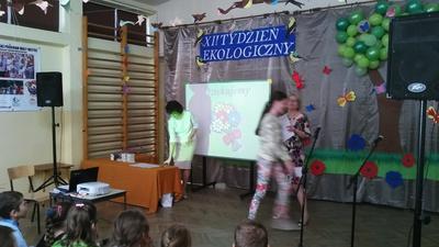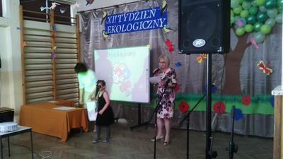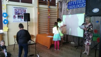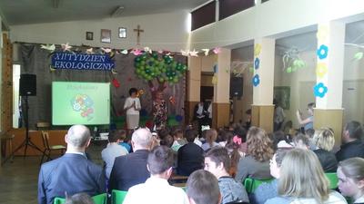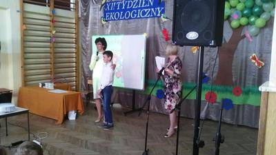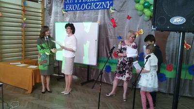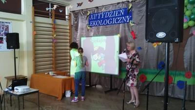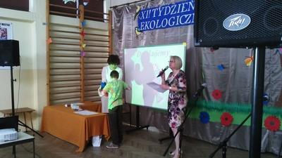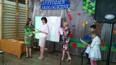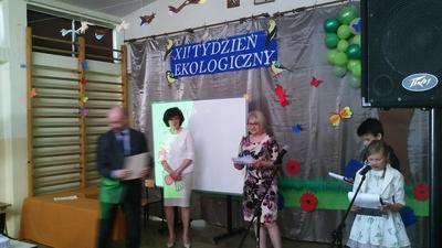 12 maja- piątek był wyjątkowym dniem w życiu naszej szkoły. Fantastyczna scenografia przygotowana ze szczególną starannością przez panie Monikę Borkowską i Joannę Tumowską, wielokrotne próby rozlicznych inscenizacji i całego scenariusza, a także powszechna świadomość tego, co zwykle ma miejsce przy okazji podsumowań Tygodnia Ekologicznego budziły napięcie i radosne oczekiwanie. Tym większe,że w obecnym roku szkolnym nasza placówka ubiega się o certyfikat Warmińsko-Mazurskiego Kuratora Oświaty „Szkoła Przyjazna Środowisku”.