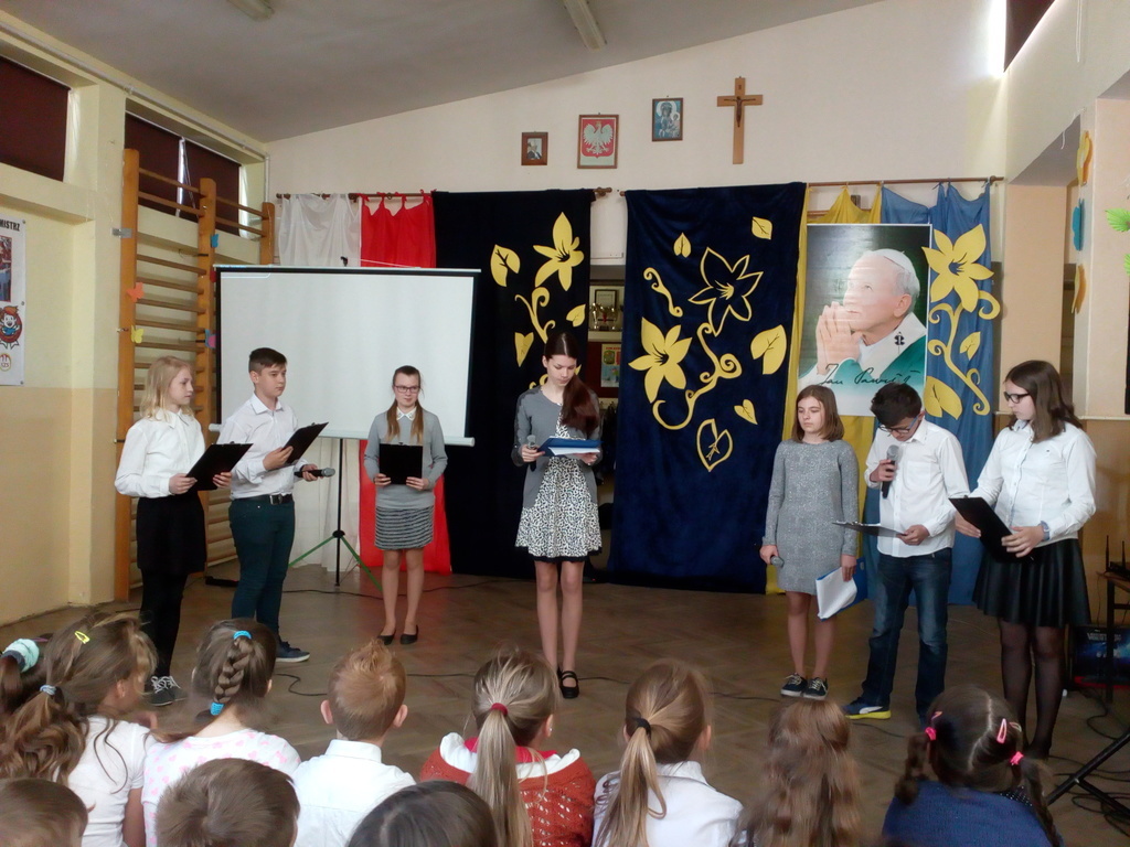Patron szkoły – Jan Paweł II – to niewątpliwe zobowiązanie. Dzień Jemu poświęcony tym bardziej powinien być przeżyty godnie. Postaraliśmy się o to miarę swoich możliwości. Przepiękna scenografia w tonacji granatu, błękitu, żółci lilii i portretu Jana Pawła II – z ciepłym spojrzeniem patrona zapraszała uczniów, nauczycieli, pracowników szkoły i rodziców do udziału w uroczystościach ku Jego czci.
