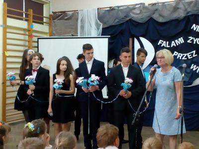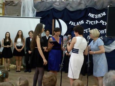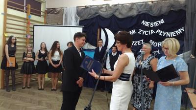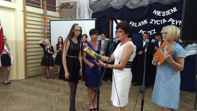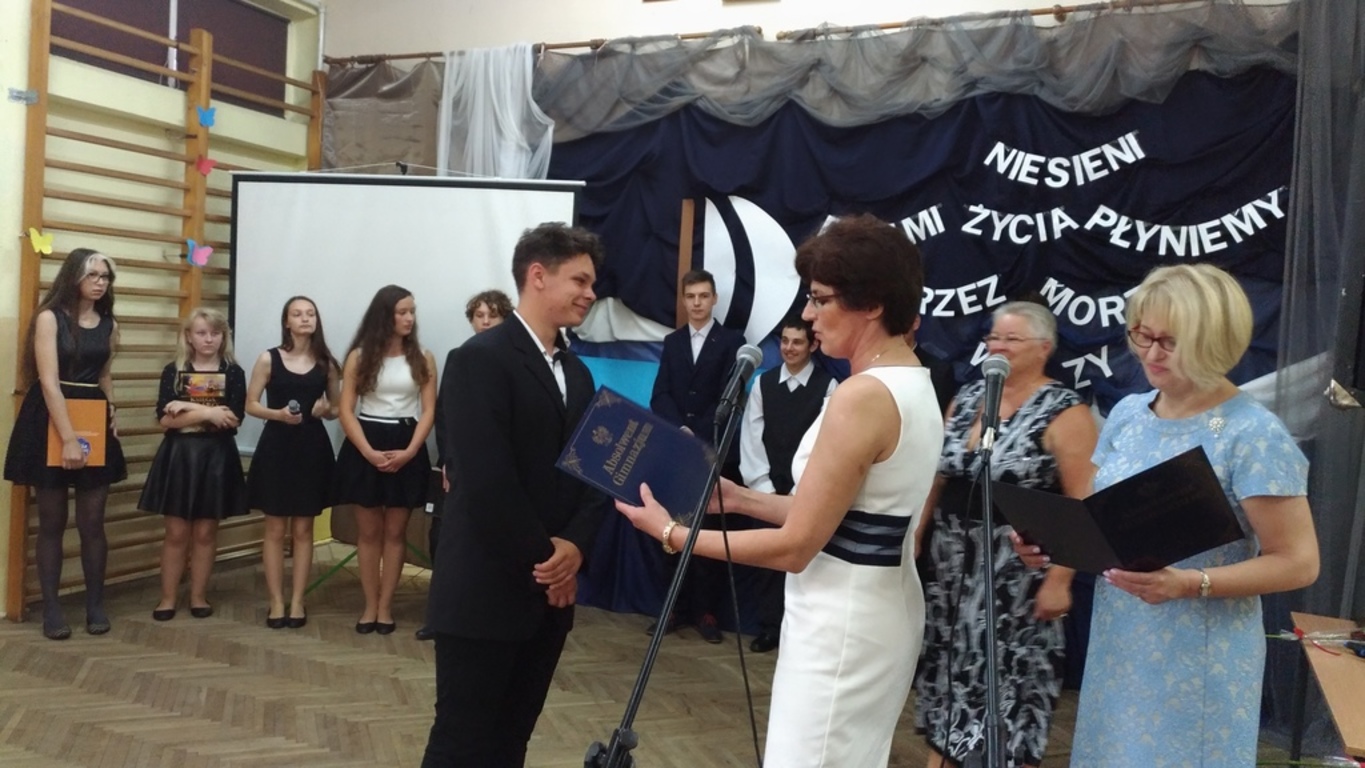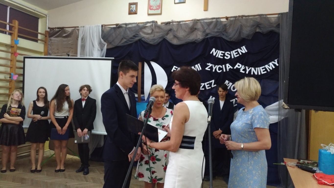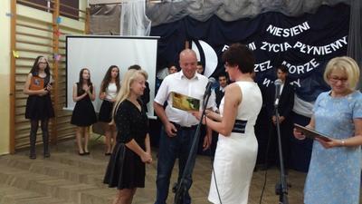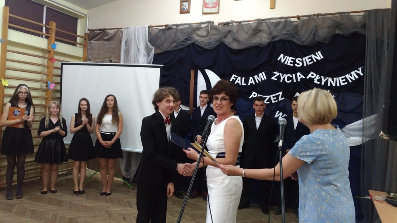 Zakończył się kolejny rok szkolny 2016/2017. Klasa III gimnazjum zapisała chlubną kartę w dziejach egzaminów zewnętrznych, uzyskując wyniki powyżej średniej wojewódzkiej i krajowej. Chwała za to uczniom i nauczycielom pracującym z nimi. Nie byłoby tego bez rodziców, którzy dziewięć lat wcześniej powierzyli szkole swoje dzieci i zaufali nauczycielom i wychowawcom – najpierw w klasach I – III SP pani Dorocie Żolik, potem przez pięć lat panu Mirosławowi Szeferowi i w ostatnim roku – pani Krystynie Zajdel. To miło, że o nich pamiętali, a także zaprosili na uroczystość byłego wychowawcę p. Mirosława Szefera i byłego dyrektora szkoły p. Janusza Bieńkowskiego. Rodzice absolwentów przygotowali boskie ciasta w podziękowaniu za nauczycielski trud. I to już koniec. Następna klasa opuszcza mury szkoły. Dominujące uczucie – radość i powodów do niej jest wiele, choćby najbardziej oczywisty – zaczynają się wakacje. Ale gdzieś głęboko w sercu jednocześnie czai się smutek. Smutek przemijania, niepokoju o przyszłą szkołę, kolejny rok szkolny. Nie czas jednak na głębokie refleksje. Inne klasy też muszą odebrać swoje nagrody i świadectwa. Te z czerwonym paskiem wręcza publicznie pani dyrektor Teresa Pupin – pierwszy raz w tej roli, ale jest wytrawnym nauczycielem, więc nie czuje tremy, radzi sobie świetnie. Pozostali uczniowie odbiorą swoje świadectwa w klasach, gdzie spotkają się z wychowawcami.