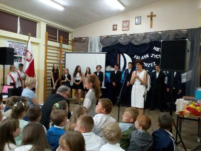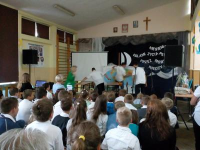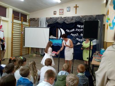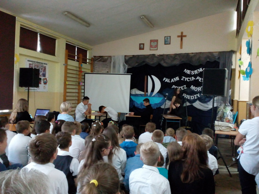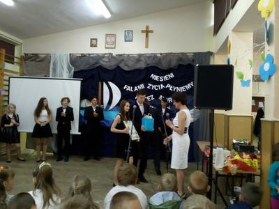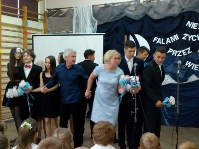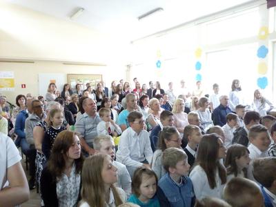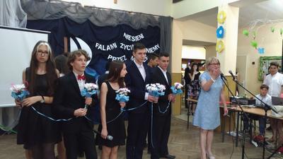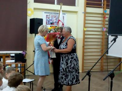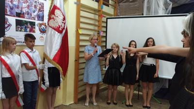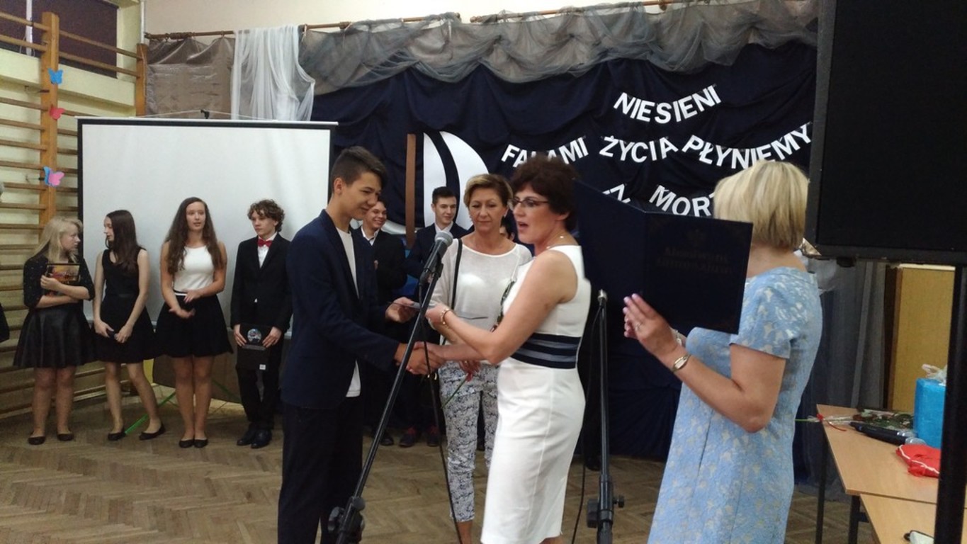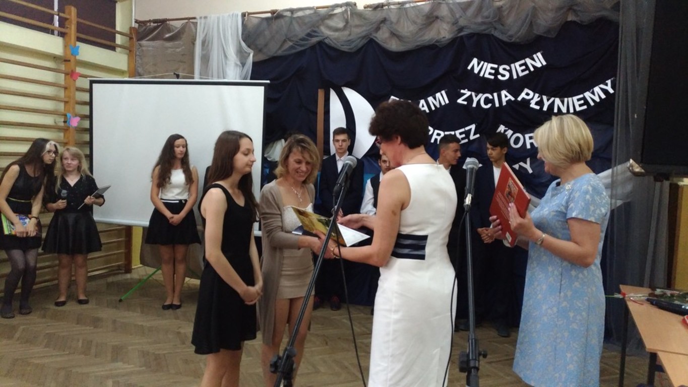 Zakończył się kolejny rok szkolny 2016/2017. Klasa III gimnazjum zapisała chlubną kartę w dziejach egzaminów zewnętrznych, uzyskując wyniki powyżej średniej wojewódzkiej i krajowej. Chwała za to uczniom i nauczycielom pracującym z nimi. Nie byłoby tego bez rodziców, którzy dziewięć lat wcześniej powierzyli szkole swoje dzieci i zaufali nauczycielom i wychowawcom – najpierw w klasach I – III SP pani Dorocie Żolik, potem przez pięć lat panu Mirosławowi Szeferowi i w ostatnim roku – pani Krystynie Zajdel. To miło, że o nich pamiętali, a także zaprosili na uroczystość byłego wychowawcę p. Mirosława Szefera i byłego dyrektora szkoły p. Janusza Bieńkowskiego. Rodzice absolwentów przygotowali boskie ciasta w podziękowaniu za nauczycielski trud. I to już koniec. Następna klasa opuszcza mury szkoły. Dominujące uczucie – radość i powodów do niej jest wiele, choćby najbardziej oczywisty – zaczynają się wakacje. Ale gdzieś głęboko w sercu jednocześnie czai się smutek. Smutek przemijania, niepokoju o przyszłą szkołę, kolejny rok szkolny. Nie czas jednak na głębokie refleksje. Inne klasy też muszą odebrać swoje nagrody i świadectwa. Te z czerwonym paskiem wręcza publicznie pani dyrektor Teresa Pupin – pierwszy raz w tej roli, ale jest wytrawnym nauczycielem, więc nie czuje tremy, radzi sobie świetnie. Pozostali uczniowie odbiorą swoje świadectwa w klasach, gdzie spotkają się z wychowawcami.