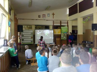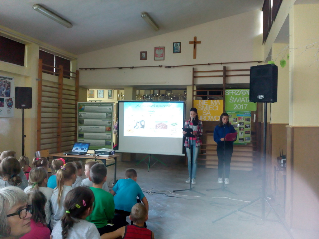 Uczennice oddziałów gimnazjalnych – Zuzia Łuszczak i Gabrysia Stróg przygotowały ciekawą prezentację propagującą ograniczanie powstawania odpadów, selektywną zbiórkę i recykling. Prawdziwe zainteresowanie zebranych uczniów i nauczycieli wzbudził jednak film edukacyjny pokazujący, jakim ciekawym surowcem mogą stać się zużyte zwyczajne, plastikowe butelki. Wyczarowywane z nich na oczach dzieci lejki, łyżeczki, estetyczne opakowania prezentów, zbiorniki na wodę, stojaki na naczynia czy nawet zraszacze ogrodowe – budziły zachwyt i zdziwienie. W Nowej Zelandii szkło z butelek po piwie przerabia się na piasek wysypywany na plaże… Dobry sposób na recykling. Śmieci mądrze zagospodarowane mogą stać się surowcami. W polskich realiach też jest to możliwe właśnie m. in. dzięki takim akcjom jak „Sprzątanie świata” odbywającym się od 1994 roku w trzeci weekend września, zainicjowanym przez Mirę Stanisławską – Meysztowicz, założycielkę Fundacji Nasza Ziemia, a wymyślonym w Australii.
