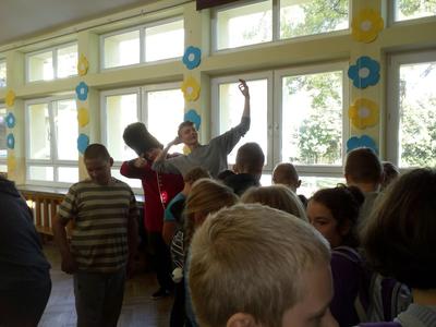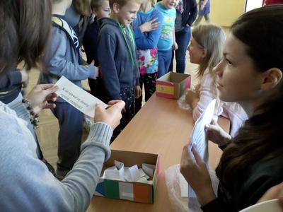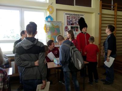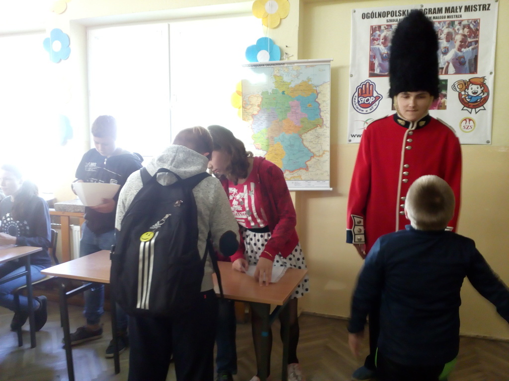 Dwie potężne, kłębiące się uczniowskie kolejki zwracały dziś uwagę wszystkich wchodzących do naszej szkoły około godziny 10:00. Za stolikami siedziała dwójka gimnazjalistów, na oczach których odbywało się losowanie pytań dotyczących języków europejskich. Za poprawną odpowiedź szczęśliwiec natychmiast otrzymywał czekoladkę. Mógł również zrobić efektowne zdjęcie z angielską wartą sprzed Pałacu Buckingham w Londynie…