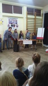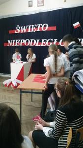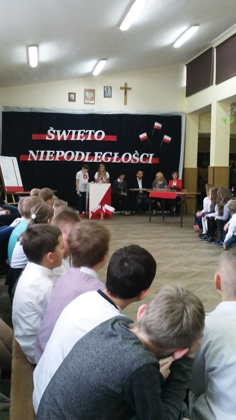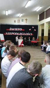 Piękny, starannie wykonany napis biegnący wzdłuż głównej ściany holu – „Święto Niepodległości” – od rana kierował myśli do uroczystości, która miała się odbyć 13 listopada na trzeciej godzinie lekcyjnej. Jednak biało – czerwona urna dla prowadzących, ustawione z przemyślaną dokładnością ławeczki i krzesła dla uczniów z wychowawcami, a przede wszystkim miejsca wyznaczone dla dwóch drużyn – Białych i Czerwonych – świadczyły o tym, że obchody 99. rocznicy odzyskania przez Polskę niepodległości będą tym razem wyglądać inaczej niż zwykle w naszej szkole. Tak też było …