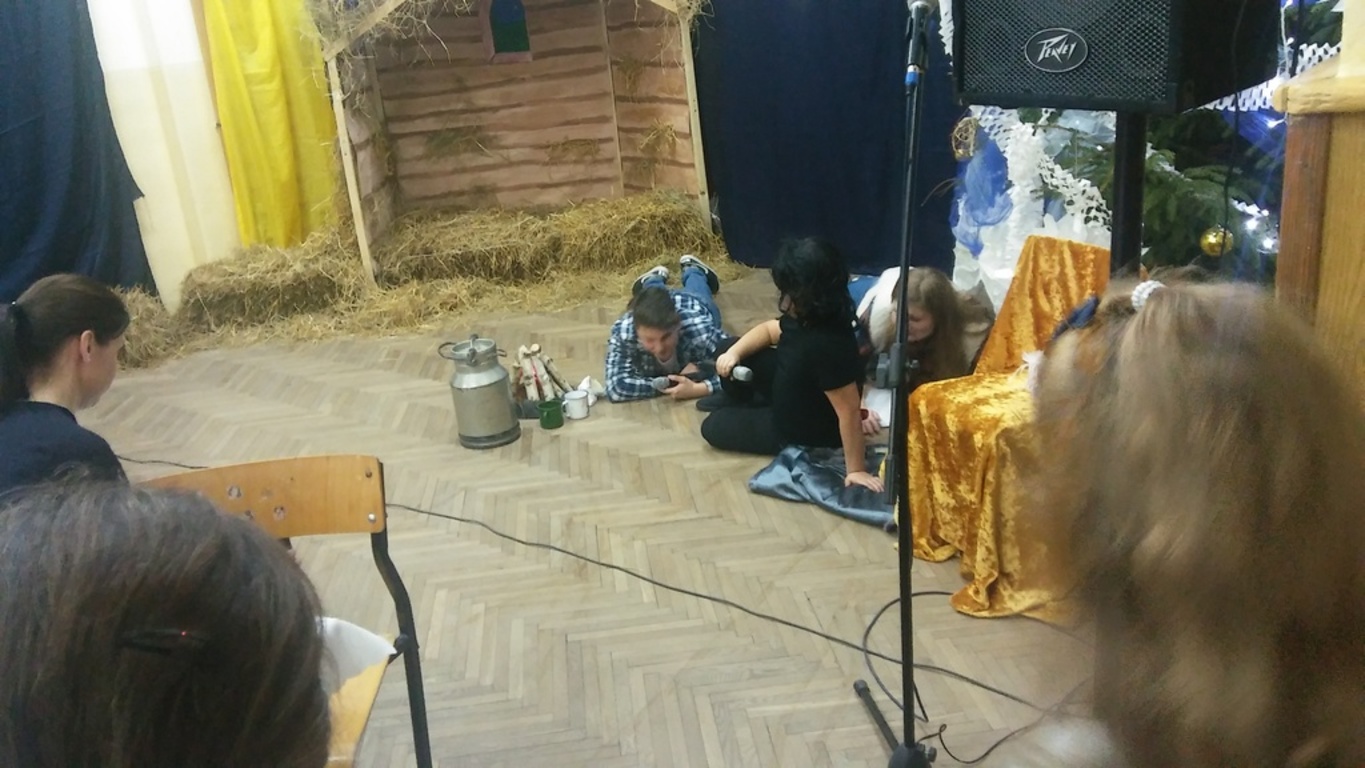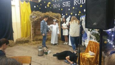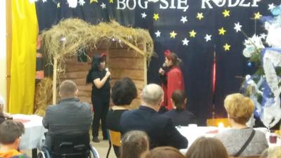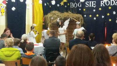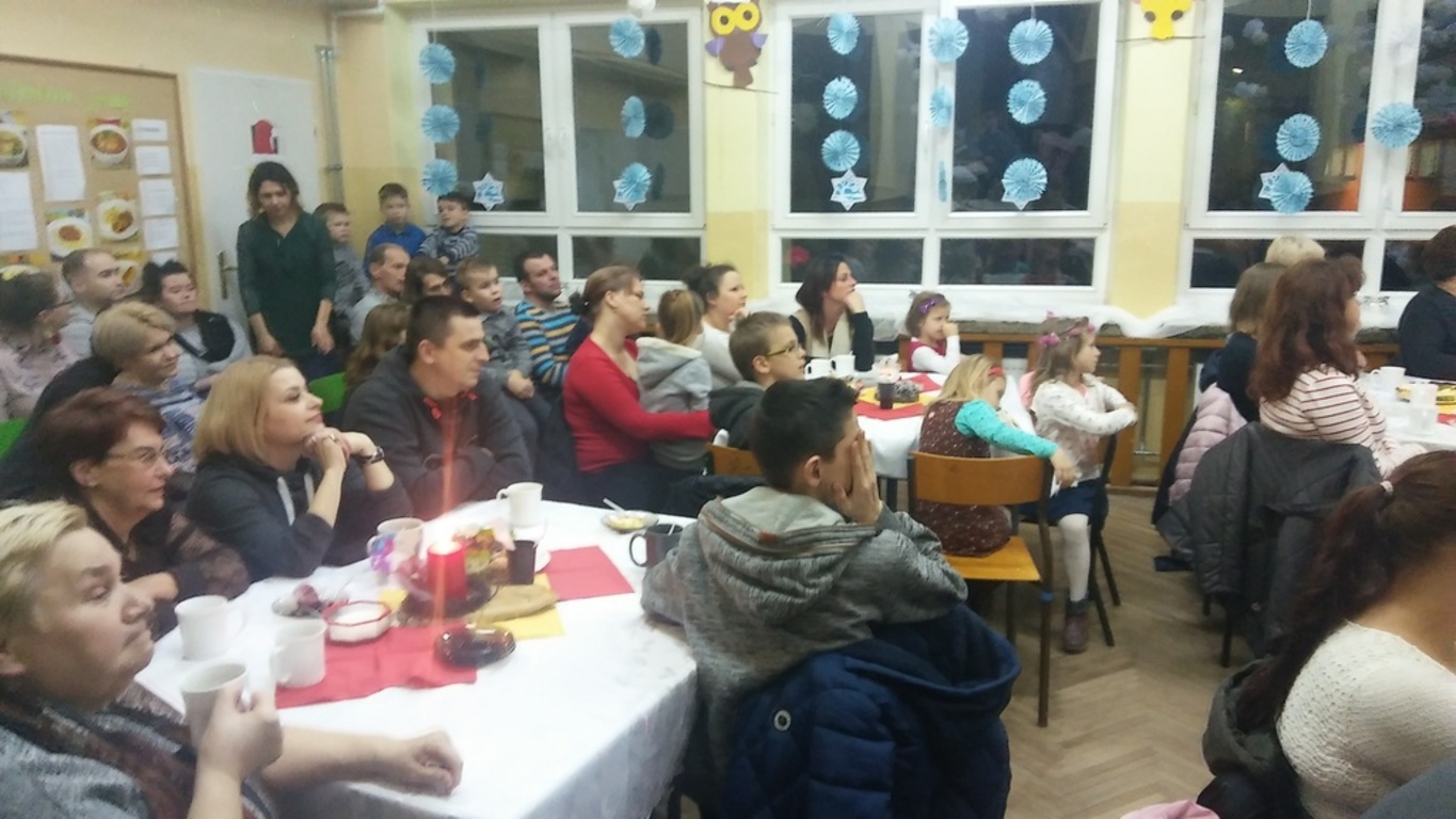W tak miłej atmosferze rozpoczęła się kolejna „Kawiarnia artystyczna”, którą otworzyła pani dyrektor, witając zebranych. Punktem centralnym spotkania były jasełka przygotowane przez uczniów klasy IV i kolegów z klas starszych pod opieką pani Krystyny Zajdel i pani Doroty Wojszko – Kisiel. Znów wypadły znakomicie. Poszczególne kwestie płynęły potoczyście, przykuwały uwagę tym bardziej, że scenariusz dotykał problemów aktualnych, np. tolerancji oraz został napisany barwnym, dowcipnym językiem, wywołującym śmiech wśród widowni. Jednocześnie dzięki inicjatywie rodziców i pań organizatorek przedsięwzięcia zebrani mogli skosztować pysznych ciast, wypić ciepłe napoje.