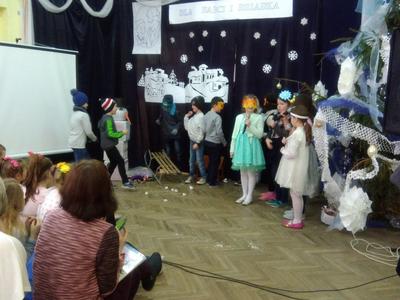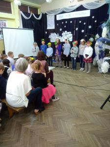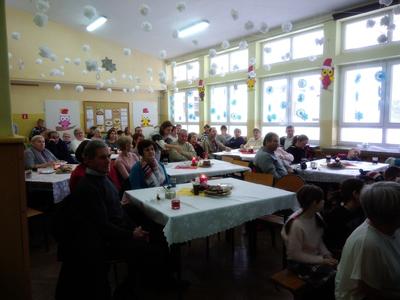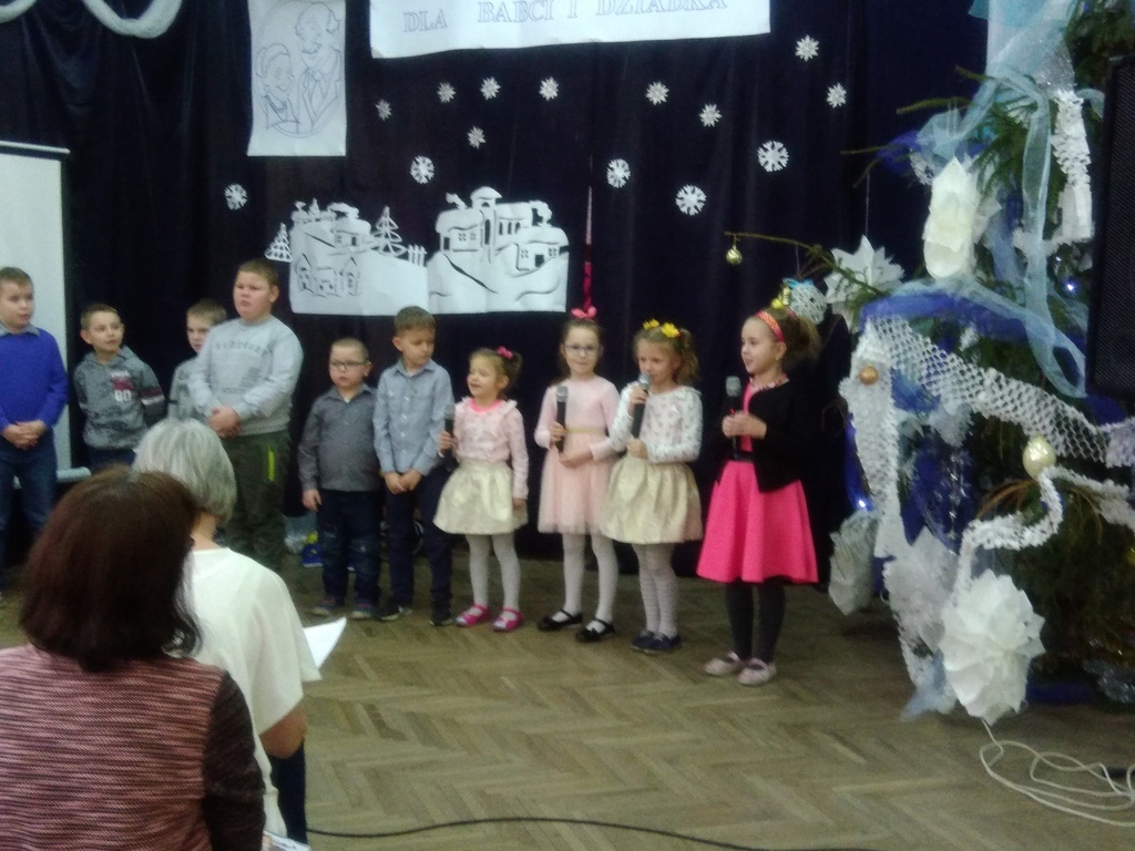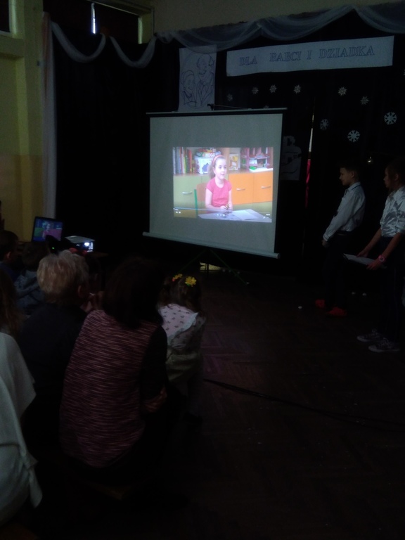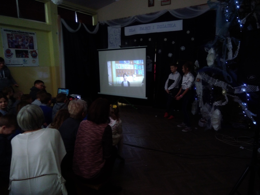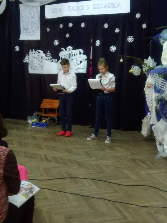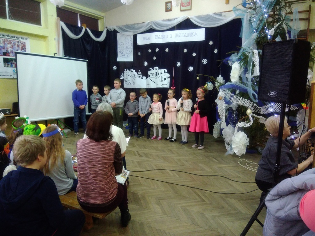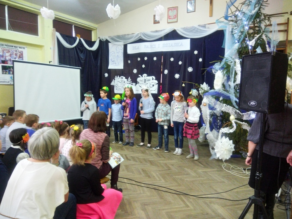 Od rana trwały ostatnie przygotowania, w które angażowała się cała szkoła. Granatowo – biała, zimowa dekoracja, biel stolików, ciasta, kawa, herbata, instalacja sprzętu nagłaśniającego – wszystko gotowe, jeszcze tylko końcowe, niezbędne uwagi do małych wykonawców i oto przybywają już pierwsi goście… Równo o godzinie 10:00 powitała ich serdecznie pani dyrektor i złożyła życzenia. Potem sprawy w swoje ręce wzięli uczniowie klas od „zerówki” po szóstą, prezentując piosenki, wiersze, inscenizacje. Licznie w tym roku zgromadzeni goście – Babcie i Dziadkowie uśmiechali się radośnie, bili brawo, robili zdjęcia. Najbardziej oczekiwanym momentem uroczystości była