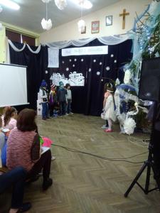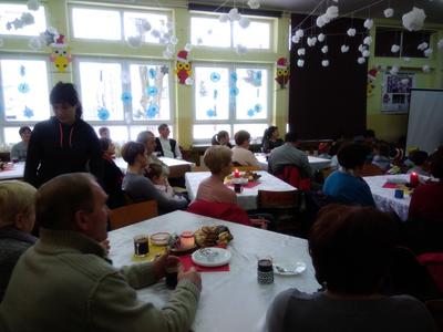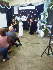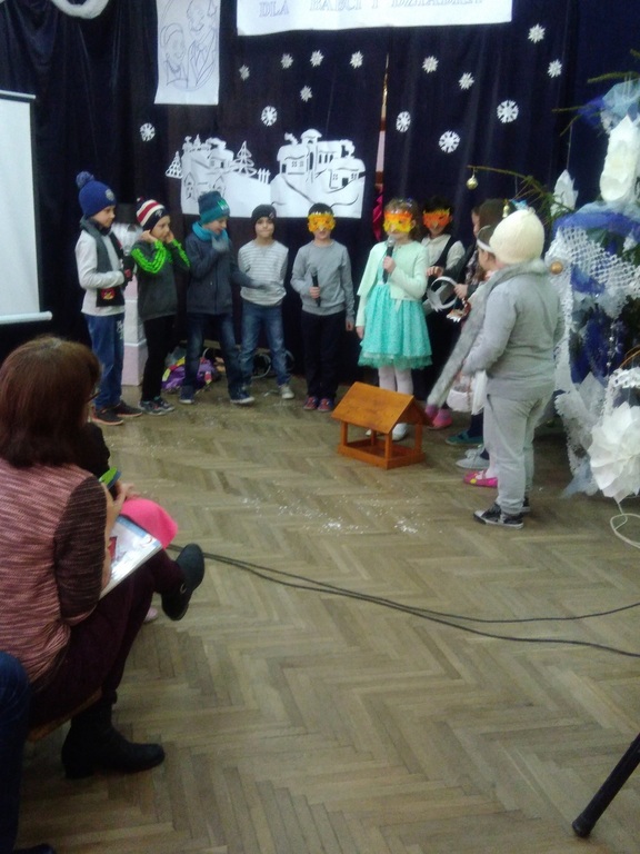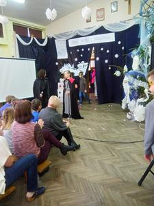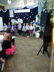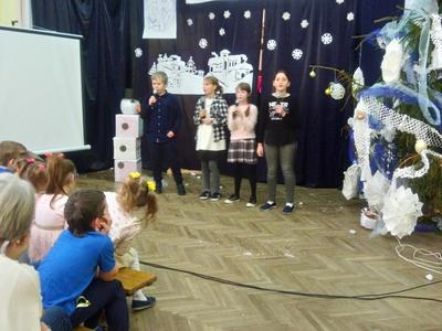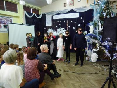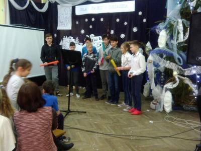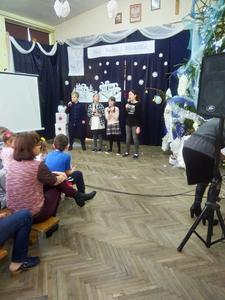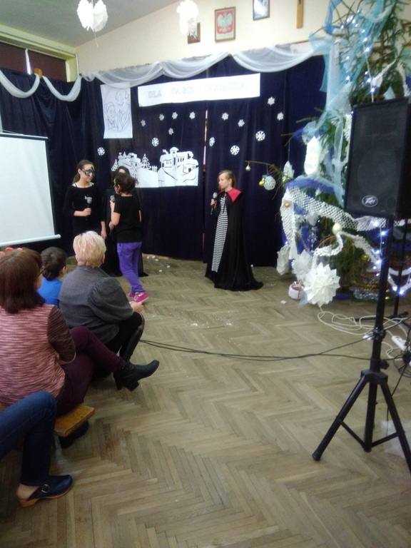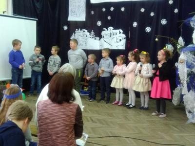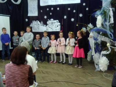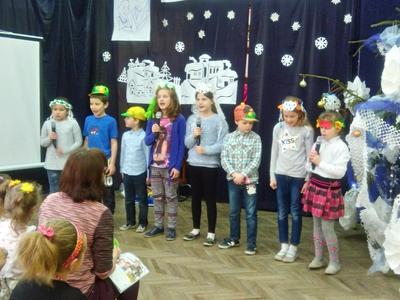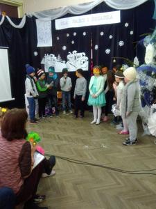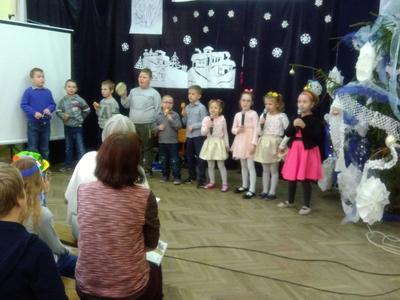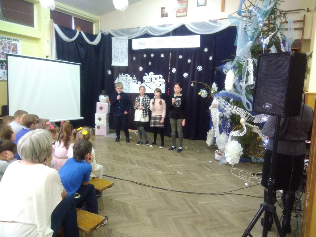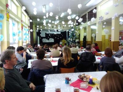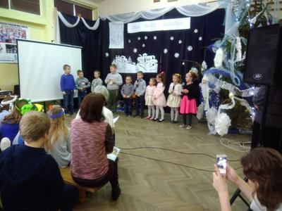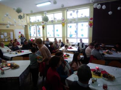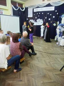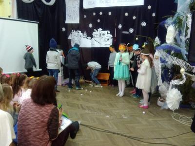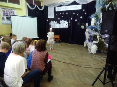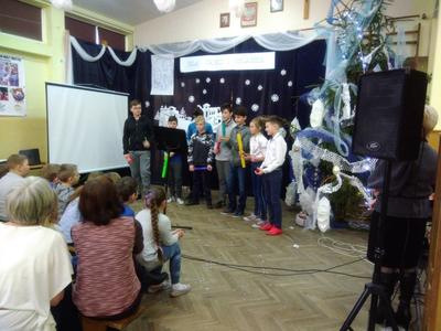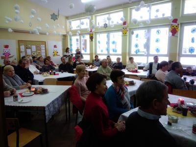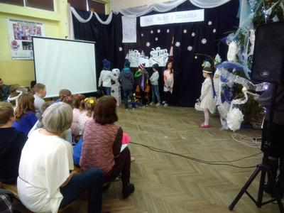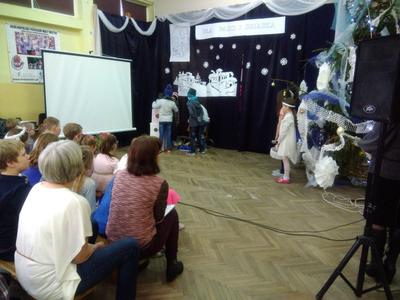 Od rana trwały ostatnie przygotowania, w które angażowała się cała szkoła. Granatowo – biała, zimowa dekoracja, biel stolików, ciasta, kawa, herbata, instalacja sprzętu nagłaśniającego – wszystko gotowe, jeszcze tylko końcowe, niezbędne uwagi do małych wykonawców i oto przybywają już pierwsi goście… Równo o godzinie 10:00 powitała ich serdecznie pani dyrektor i złożyła życzenia. Potem sprawy w swoje ręce wzięli uczniowie klas od „zerówki” po szóstą, prezentując piosenki, wiersze, inscenizacje. Licznie w tym roku zgromadzeni goście – Babcie i Dziadkowie uśmiechali się radośnie, bili brawo, robili zdjęcia. Najbardziej oczekiwanym momentem uroczystości była