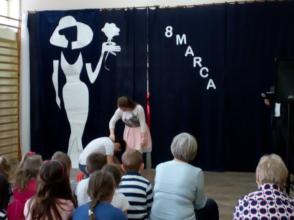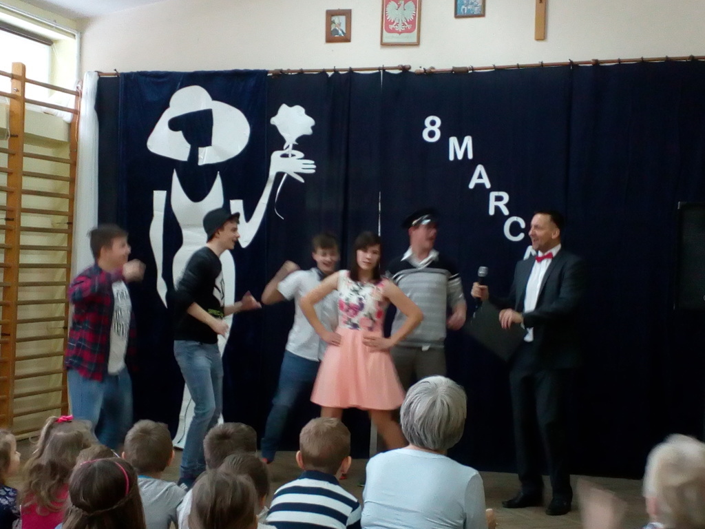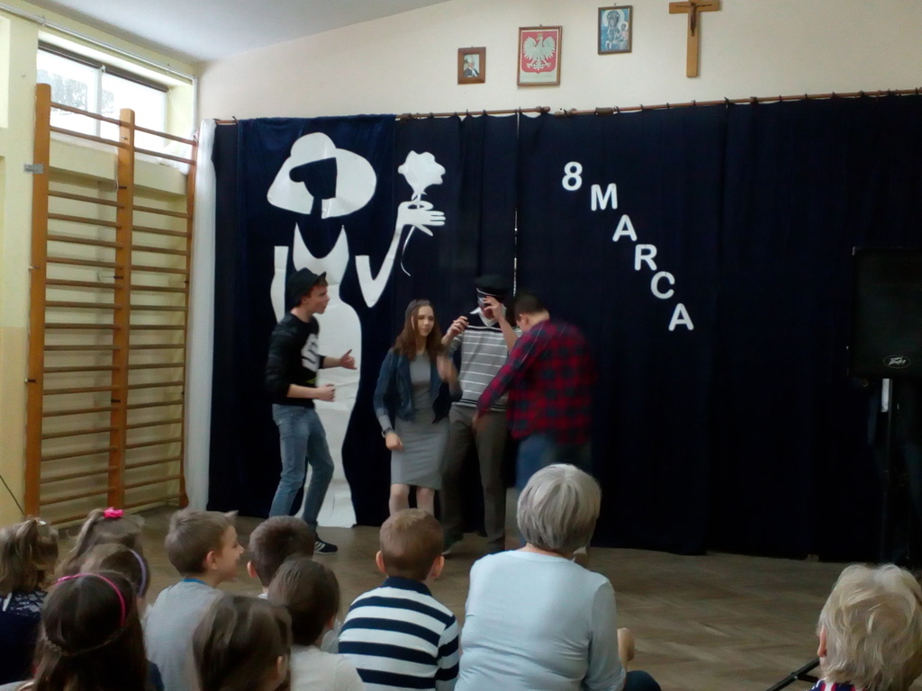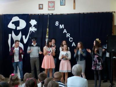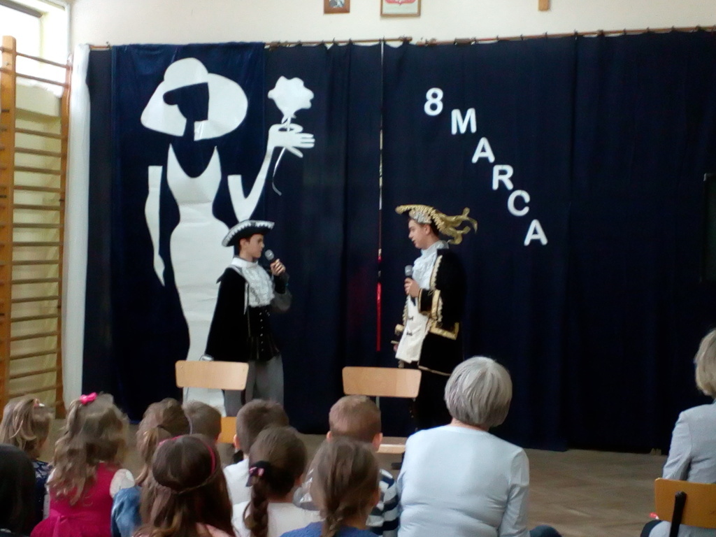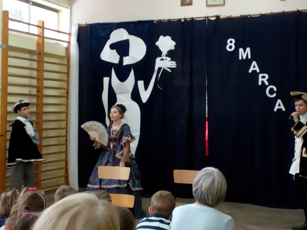 Przebieg uroczystości Święta Kobiet i jej plastyczną oprawę wymyśliła opiekunka SU – p. Joanna Duryło przy wsparciu nauczyciela historii p. Rafała Chlewińskiego. Swój świetny pomysł zrealizowała razem z uczniami III oddziału gimnazjalnego. Dawni wychowankowie p. J. Duryło bardzo dobrze weszli w swoje role. Właściwie zagrali prawie bez słów – tanecznie całą historię życia kobiety, która zawsze (jak wiadomo) szuka miłości. Zrobili to z wdziękiem, sympatycznie, z wigorem właściwym młodości, poczynającod być kobietą (tu bezbłędna była Dominika Tracewicz), a kończąc na to, co mam…Piotra Rubika (piękna scenka mimiczna Julity Walczak i Mateusza Antczaka). Dowcipny pomysł i dobre wykonanie podobały się publiczności. Później zebranym Paniom i Panom dedykowano „Żonę modną” Ignacego Krasickiego w wykonaniu klasy VII. Uczniowie ambitnie podeszli do zadaniai nauczyli się na pamięć XVIII – wiecznego tekstu (będącego zresztą ich lekturą obowiązkową…) i wystąpili na scenie w strojach z epoki. (Tu wielkie podziękowania należą się ich rodzicom, którzy zadbali o wypożyczenie kostiumów.) Należy jednak przyznać, że pełen archaizmów tekst stanowił trudność w odbiorze dla współczesnych słuchaczy naszej szkoły. Na zakończenie programu wszystkie małe i duże Panie otrzymały kwiaty i drobne upominki przygotowane przez SU, panów i Radę Rodziców.