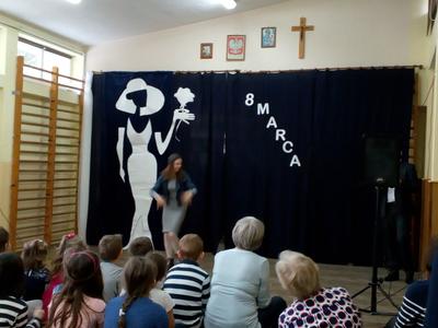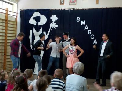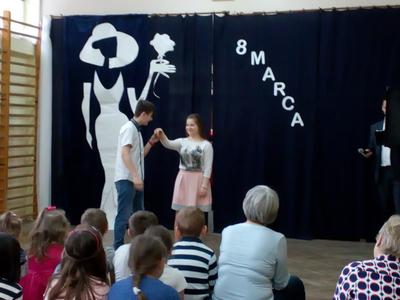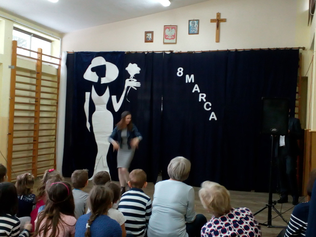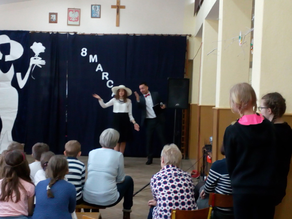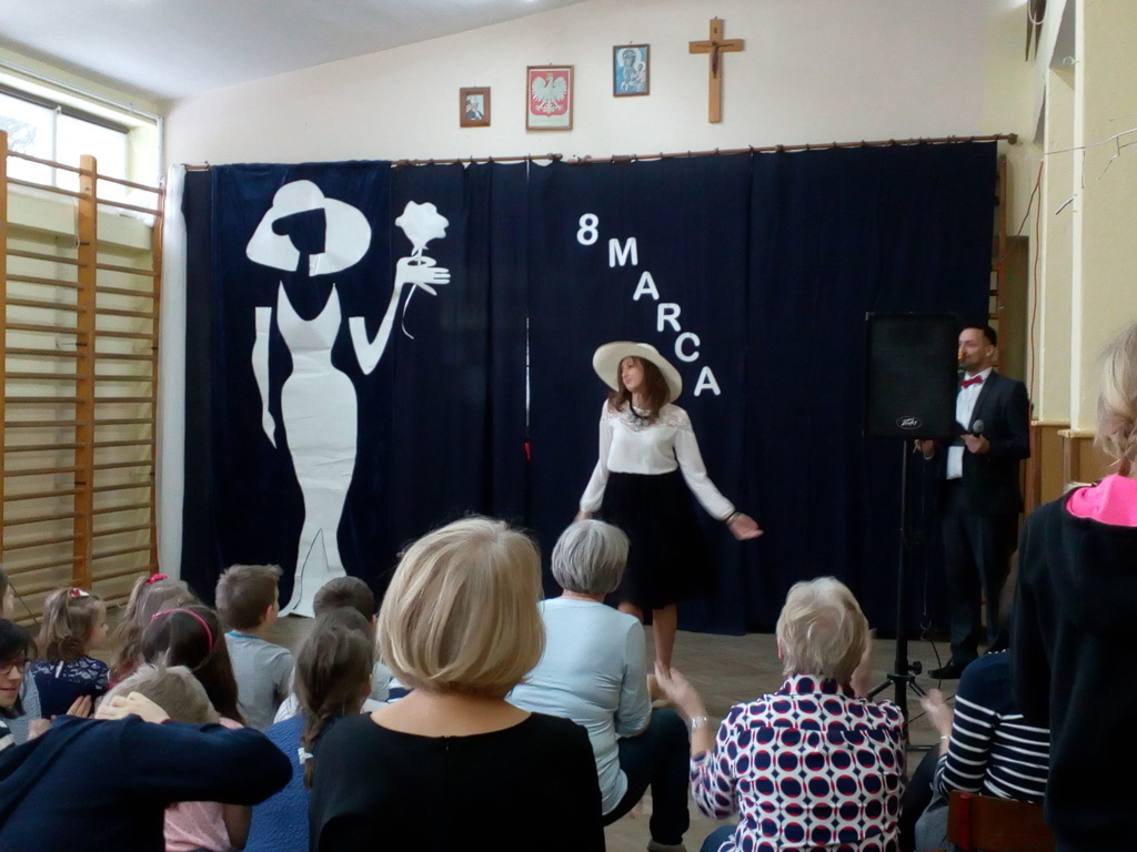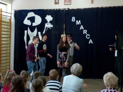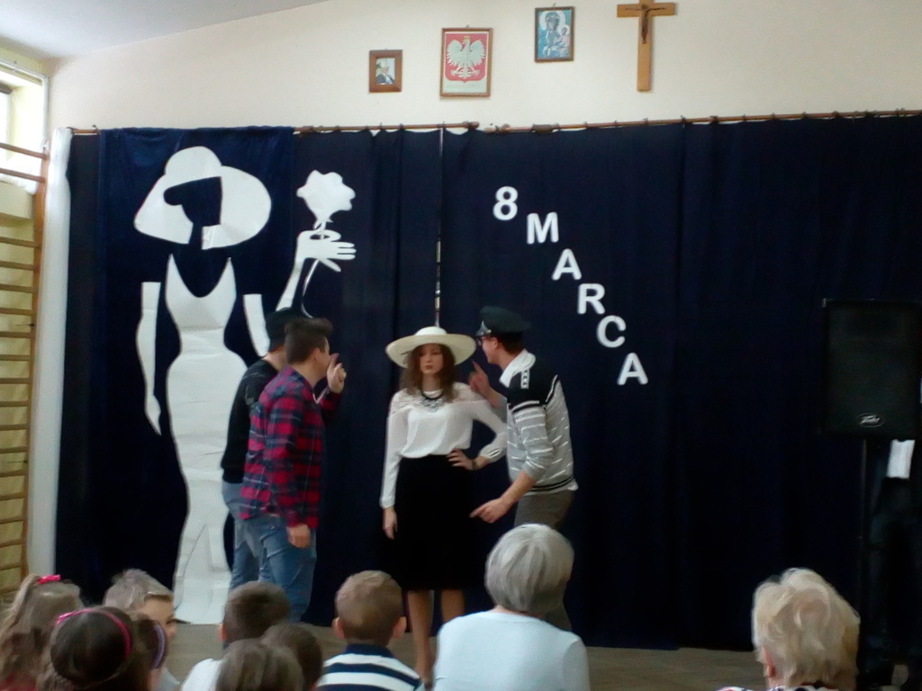 Przebieg uroczystości Święta Kobiet i jej plastyczną oprawę wymyśliła opiekunka SU – p. Joanna Duryło przy wsparciu nauczyciela historii p. Rafała Chlewińskiego. Swój świetny pomysł zrealizowała razem z uczniami III oddziału gimnazjalnego. Dawni wychowankowie p. J. Duryło bardzo dobrze weszli w swoje role. Właściwie zagrali prawie bez słów – tanecznie całą historię życia kobiety, która zawsze (jak wiadomo) szuka miłości. Zrobili to z wdziękiem, sympatycznie, z wigorem właściwym młodości, poczynającod być kobietą (tu bezbłędna była Dominika Tracewicz), a kończąc na to, co mam…Piotra Rubika (piękna scenka mimiczna Julity Walczak i Mateusza Antczaka). Dowcipny pomysł i dobre wykonanie podobały się publiczności. Później zebranym Paniom i Panom dedykowano „Żonę modną” Ignacego Krasickiego w wykonaniu klasy VII. Uczniowie ambitnie podeszli do zadaniai nauczyli się na pamięć XVIII – wiecznego tekstu (będącego zresztą ich lekturą obowiązkową…) i wystąpili na scenie w strojach z epoki. (Tu wielkie podziękowania należą się ich rodzicom, którzy zadbali o wypożyczenie kostiumów.) Należy jednak przyznać, że pełen archaizmów tekst stanowił trudność w odbiorze dla współczesnych słuchaczy naszej szkoły. Na zakończenie programu wszystkie małe i duże Panie otrzymały kwiaty i drobne upominki przygotowane przez SU, panów i Radę Rodziców.