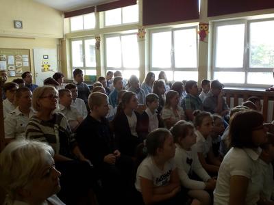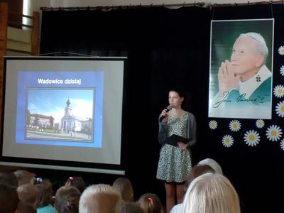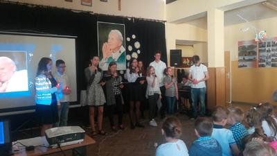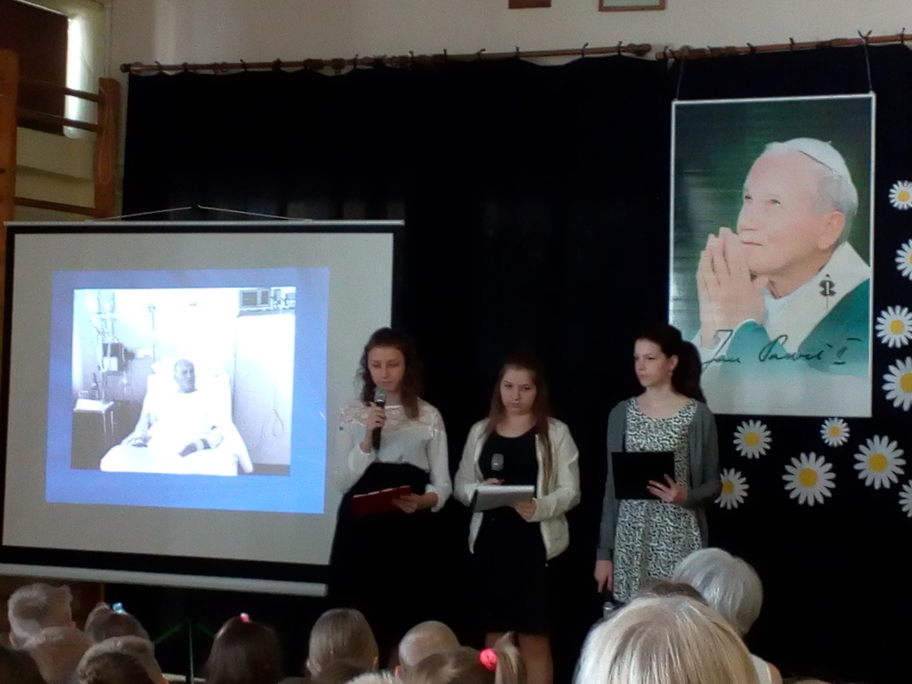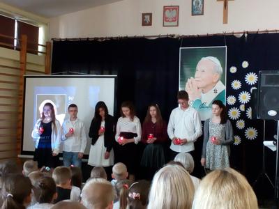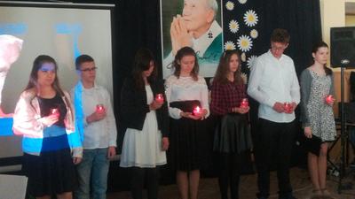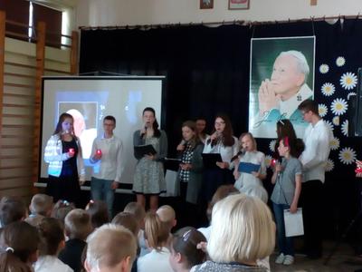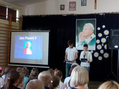 Uczniowie wysłuchali homilii ks. Adama, który wskazywał na potrzebę dumy i szacunku wobec tego symbolu, wobec szkoły i wobec jej Patrona. Zapalenie zniczy przed pomnikiem Jana Pawła II i wykonanie hymnu zakończyło tę część uroczystości. Po powrocie do szkoły młodzież wysłuchała montażu słowno – muzycznego pt. „Droga do świętości” w wykonaniu uczniów III oddziału gimnazjalnego. Towarzyszyła mu prezentacja poświęcona Ojcu Świętemu Janowi Pawłowi II, przygotowana przez ks. Adama. Muzyczną oprawę zapewnił zespół szkolny kierowany przez p. Monikę Borkowską. W zadumę i wzruszenie wprawiały słowa Papieża odtwarzane w wersji oryginalnej: Każdy z was, młodzi przyjaciele, znajduje też w życiu jakieś swoje Westerplatte. Albo: Zwyciężajcie nienawiść – miłością, nieprawdę – prawdą, przemoc – cierpieniem. Następnie uczniowie wysłuchali wiersza autorstwa p. Katarzyny Wasilewskiej poświęconego Janowi Pawłowi II.
