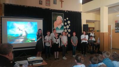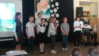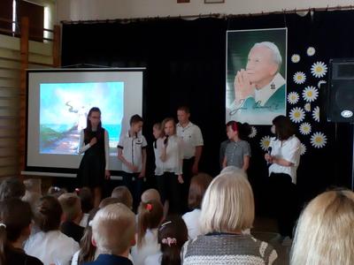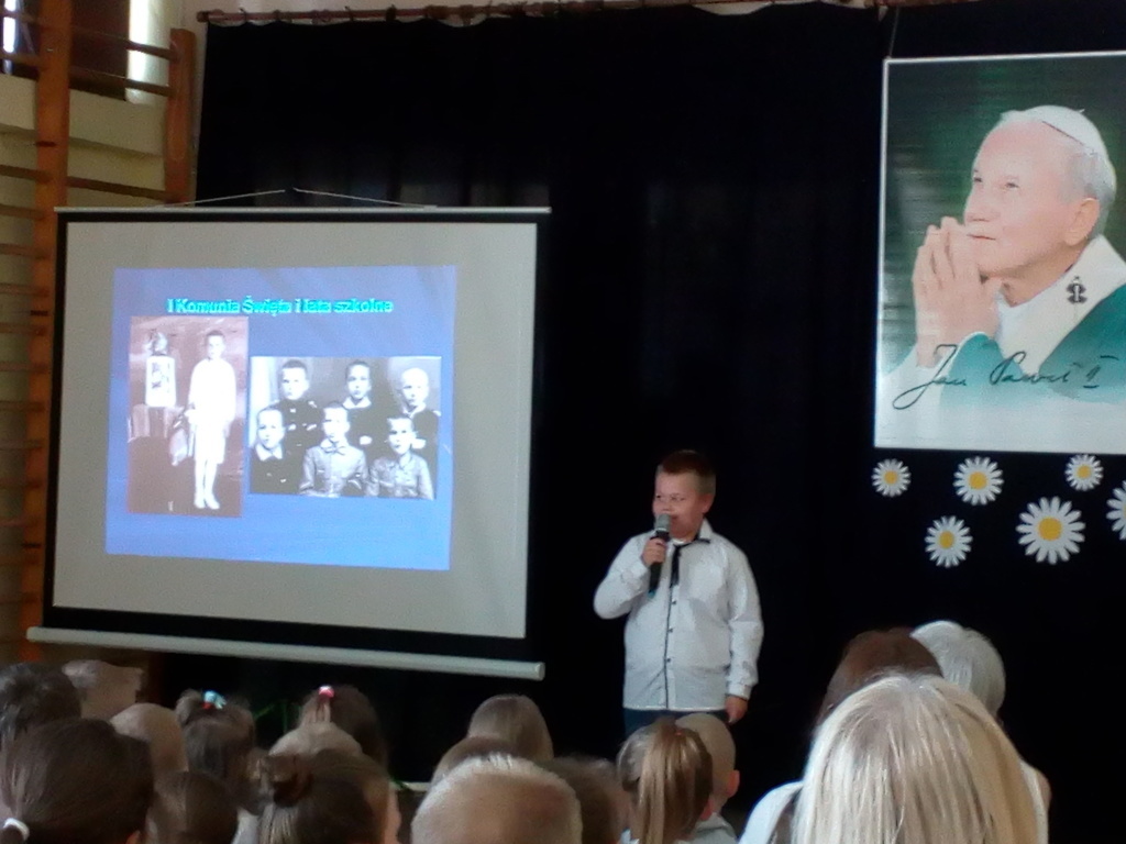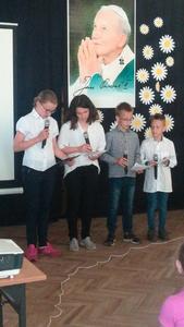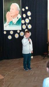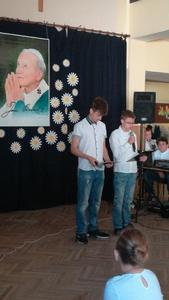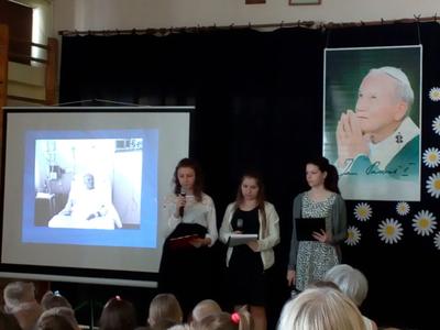 Z kolei odbyło się wręczenie nagród uczestnikom szkolnego konkursu wiedzy o naszym Patronie, przeprowadzonemu w języku angielskim przez p. Lucynę Zińczuk. O związkach Papieża ze sportem opowiedzieli uczniowie przygotowani przez nauczyciela wychowania fizycznego p. Mirosława Szefera.