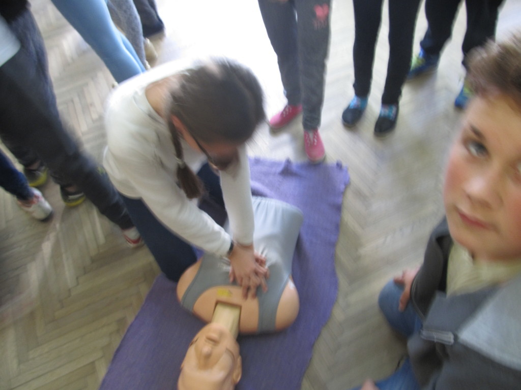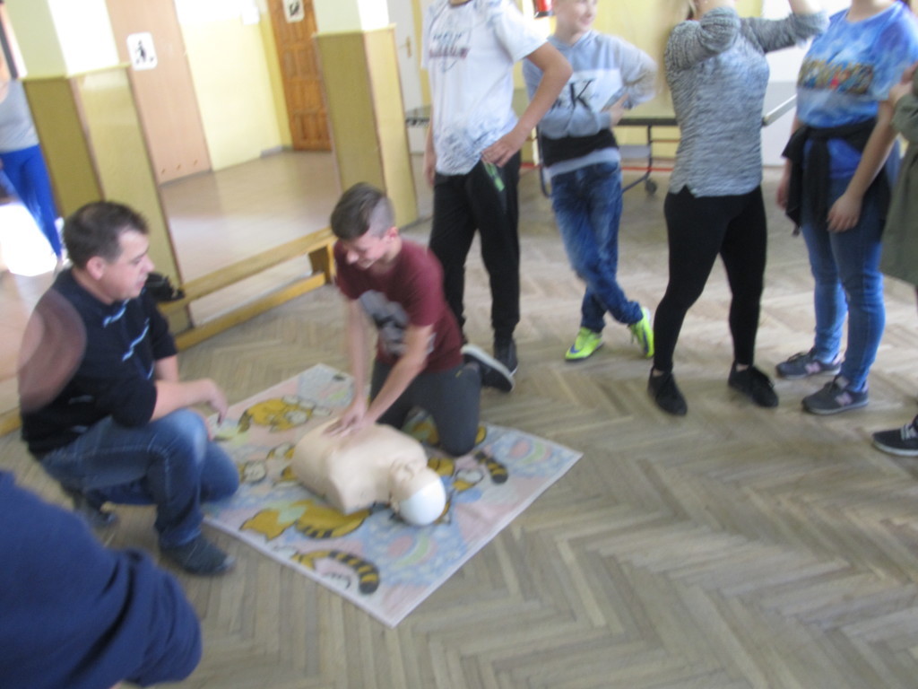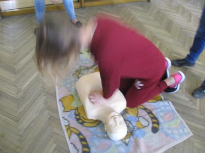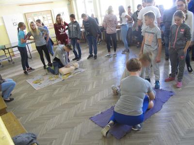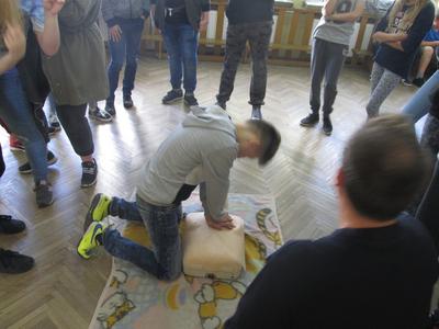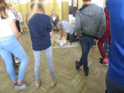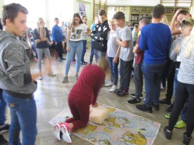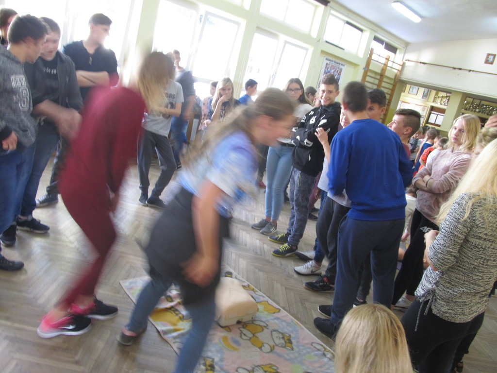 Podobnie jak w ubiegłych latach uczniowie naszej szkoły wzięli udział w tej niezwykle ważnej akcji. Bicie rekordu w jednoczesnym prowadzeniu resuscytacji krążeniowo – oddechowej przez wszystkich uczniów obecnych tego dnia w szkole odbyło się 16.10.2018 r. i trwało od godziny 12:00 do godziny 12:30. Tuż przed rozpoczęciem Pan Piotr Kwiatkowski – szkolny koordynator akcji - przypomniał zasady prowadzenia resuscytacji, podzielił uczniów na cztery grupy wiekowe; tyle mieliśmy fantomów. Sekundy przed godziną dwunastą młodzież odliczyła głośno czas i punktualnie w południe uczniowie przystąpili do bicia rekordu. To niesamowite, że zarówno starsi, jak i młodsi z wielkim zaangażowaniem włączyli się do akcji. Każdy podchodził do fantoma i ćwiczył resuscytację. Kiedy się zmęczył, zmieniał go kolega lub koleżanka.