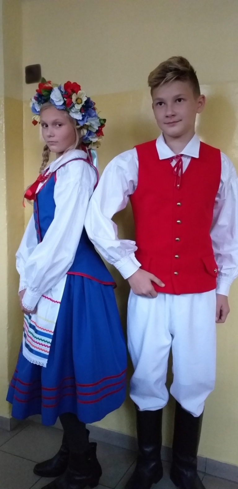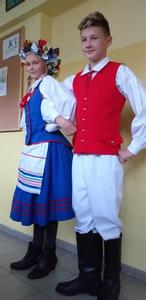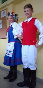 Naszymi modelami byli uczniowie Wiktor Choiński i Ewa Jakubowicz. Ich pierwsze wystąpienie publiczne w strojach ludowych, które powstały na warsztatach, odbyło się podczas apelu ŚLUBOWANIA pierwszoklasistów i wywołało niemałe zainteresowanie wśród rodziców i uczniów. Stroje bardzo się podobały. Postanowiliśmy, że tradycją w naszej szkole będzie prowadzenie uroczystości szkolnych w tych właśnie strojach.