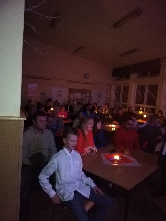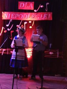 Odbywający się w naszej szkole corocznie w listopadzie muzyczny przegląd pod nazwą Cecyliada (od imienia św. Cecylii – patronki chórów i muzyków) w tym roku miał rzeczywiście szczególny charakter. Śpiewająco, muzycznie oddawaliśmy hołd Niepodległej Ojczyźnie. Fakt, że Cecyliada miała swoją jedenastą edycję, też jest znamienny. Wszak 11 listopada sto lat temu staliśmy się wolnym krajem … Główna organizatorka przedsięwzięcia, nauczycielka muzyki, p. Monika Borkowska oraz dbający o sprawy techniczne ks. Adam Malak dołożyli starań, by godnie uczcić to wyjątkowe wydarzenie. Hol szkolny zamieniono w przytulną kawiarnię, zapraszającą gości do zajęcia miejsc. Przyszli tłumnie – rodzice, dziadkowie, absolwenci szkoły, uczniowie. Prowadzący spotkanie (dwójka dzieci z klasy V) zapraszali kolejnych uczestników przeglądu na scenę. Byli nimi uczniowie ze szkolnego zespołu muzycznego oraz z klas 0 – VI, VIII i III gimnazjum. Pierwsza piosenka pt. Co to jest niepodległość w wykonaniu debiutujących w zespole dziewcząt (Julii, Jagody, Kasi, Gabrysi, Weroniki i Jowity) stanowiła swoistą muzyczną tezę, rozwijaną potem kolejnymi śpiewającymi argumentami, uzupełnianymi faktami historycznymi. Prowadzący bowiem wyjaśniali okoliczności powstawania kolejnych utworów muzycznych, przypominając w ten sposób trudne dzieje naszych dążeń niepodległościowych. Usłyszeliśmy więc Pierwszą kadrową, Piechotę, Marsz Sybiraków, Ojczyzno ma czy Przybyli ułani – utwór wykonany z pasją przez najmłodszych. Starsze dziewczęta ze szkolnego zespołu muzycznego z gitarowym towarzyszeniem nauczyciela historii zaśpiewały piosenki dotyczące okresu II wojny światowej: Dziewczyna z granatem, Dziś idę walczyć mamo. Piękno naszej Ojczyzny sławiły z kolei piosenki wykonane przez uczniów klas IV i VI. Swoistym podsumowaniem muzycznej tezy była patriotyczna pieśń z okresu Solidarności – Niepodległa, niepokorna zaśpiewana przez zespół muzyczny. Potem na scenie, jak co roku, wystąpił absolwent naszej szkoły – Remek Pawelczyk. Tym razem towarzyszyły mu jego uczennice. Goście, zgodnie z formułą wieczoru, wykonali na żywo kilka utworów patriotycznych.