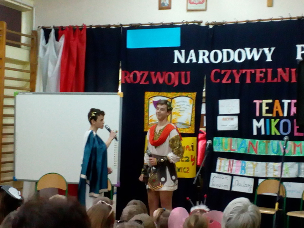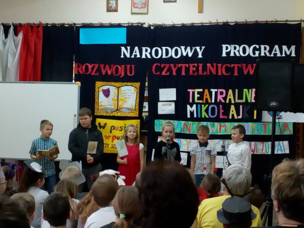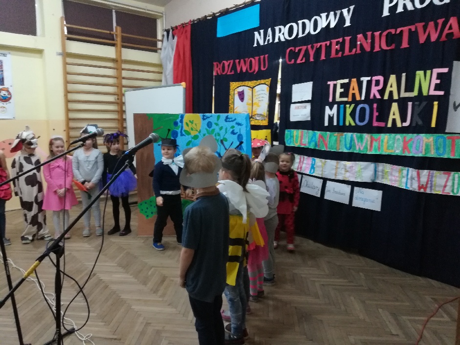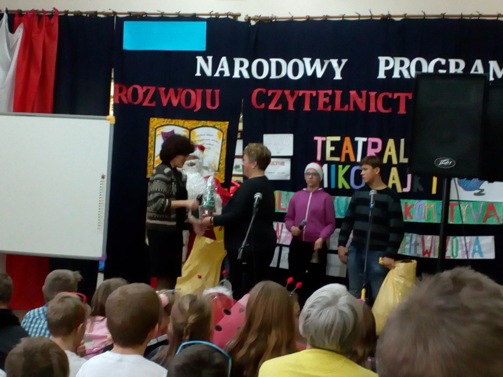 „Czytanie książek to najpiękniejsza zabawa, jaką sobie ludzkość wymyśliła.” To trafne spostrzeżenie Wisławy Szymborskiej stało się inspiracją do spotkania zatytułowanego „Teatralne mikołajki”, które miało miejsce 6 grudnia w naszej szkole. Uczniowie poszczególnych klas zaprezentowali na szkolnej scenie własne – teatralne interpretacje tekstów literackich polskich autorów. Był więc Brzechwa, Tuwim, Sienkiewicz, Mickiewicz, Jurgielewiczowa czy Mrożek. Świetne pomysły sceniczne prześcigały się w rywalizacji o oryginalność ze scenografią, rekwizytami czy kostiumami aktorów z różnych klas. Różnorodność tekstów, żywiołowość wykonania, nieukrywany zapał, pasja, zarówno wykonawców jak i nauczycieli, przyciągały uwagę widzów, a wśród nich rodziców uczniów, którzy gościli w naszej szkole z racji zaplanowanego na dziś podsumowania realizacji Narodowego Programu Rozwoju Czytelnictwa w formie miniprzeglądu teatralnego.