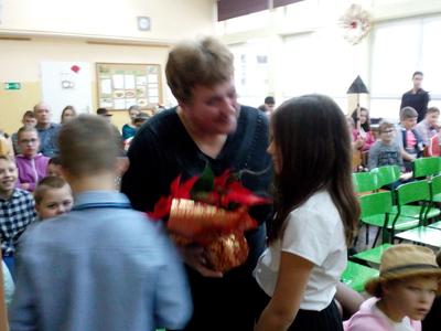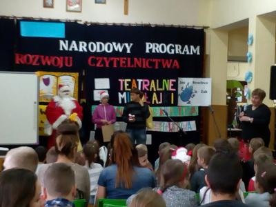 Oprócz licznie przybyłych rodziców, nauczycieli – na czele z panią dyrektor Teresą Pupin, uczniów przywitaliśmy w naszej szkole panią Mirosławę Kaczmarczyk, reprezentującą Filię Biblioteki Publicznej w Sątocznie. Powodem tego wyjątkowego spotkania mikołajkowego było uczestnictwo Szkoły Podstawowej im. Jana Pawła II w Sątocznie w Narodowym Programie Rozwoju Czytelnictwa. W ubiegłym roku nasza placówka, w ramach powyższego programu, złożyła wniosek na zakup książek do biblioteki. Celem programu jest „Rozwijanie zainteresowań uczniów przez promowanie i wspieranie rozwoju czytelnictwa wśród dzieci i młodzieży, w tym zakup nowości wydawniczych.” No i udało się. 8 miesięcy temu, w kwietniu 2018 roku otrzymaliśmy dofinansowanie i zakupiliśmy do biblioteki szkolnej 275 książek. Wcześniej zasięgnęliśmy w tej sprawie opinii rodziców, uczniów i nauczycieli. Kupiliśmy przede wszystkim lektury szkolne w nowej, atrakcyjnej szacie graficznej, także te dopiero wprowadzone do kanonu. Zakupiono cieszące się popularnością wśród czytelników naszej biblioteki książki z gatunku fantasy, przygodowe, obyczajowe i bajki. Sukces był możliwy dzięki determinacji p. dyrektor Teresy Pupin oraz p. Katarzyny Wasilewskiej – naszej bibliotekarki szkolnej. Teraz mogliśmy przystąpić do praktycznej realizacji celów programu. Promowaliśmy czytelnictwo w czerwcu w ramach ogólnopolskiej akcji „Jak nie czytam jak czytam” czy podczas festynu rodzinnego. Księgozbiór biblioteki szkolnej został udostępniony uczniom na wakacje. Od początku bieżącego roku szkolnego nasza biblioteka jest miejscem licznych konkursów