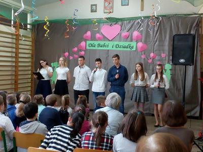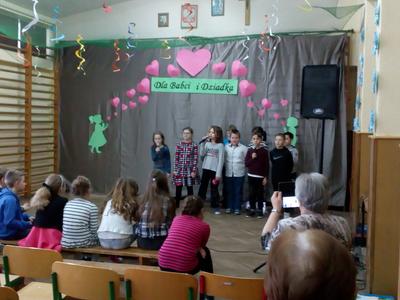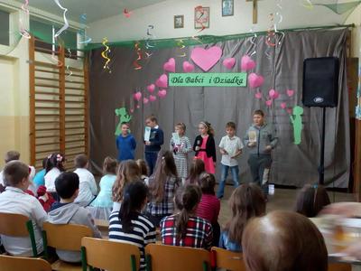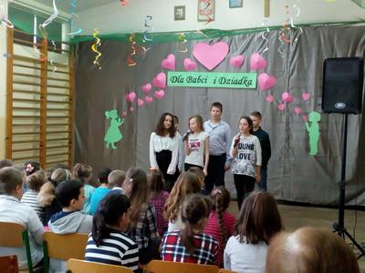 Wspólne, środowiskowe obchody Dnia Babci i Dziadka stały się tradycją naszej szkoły, by nauczyć młodzież szacunku do starszych obdarzonych mądrością życiową, doświadczeniem, naturalną dobrocią i miłością. Uczniowie obdarowali ich tym, co potrafią najlepiej – wierszami, piosenkami i tańcem. Na początku w radosny nastrój wprawił zebranych śpiew klasy IV,