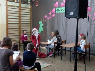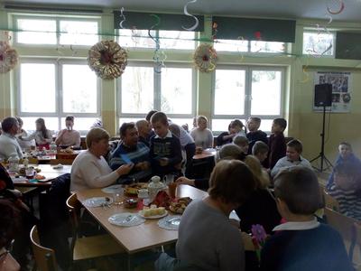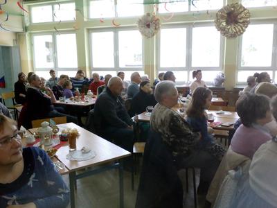Gdy kolejni uczniowie prezentowali swoje umiejętności, między barwnymi stolikami krążyły dziewczęta z Samorządu Uczniowskiego, podając gościom kawę, herbatę, ciasta. „Nasi kochani – babcia i dziadek” – taką piosenkę zaśpiewała