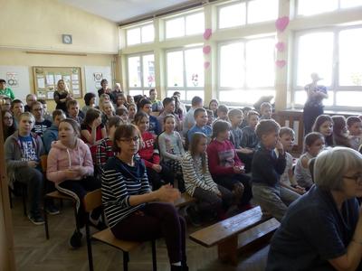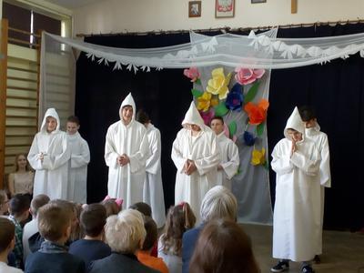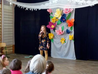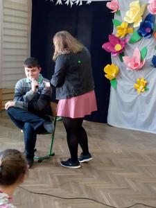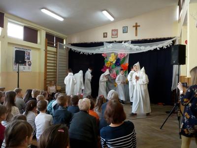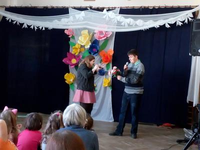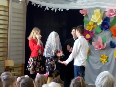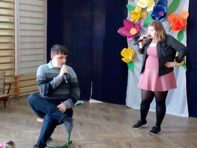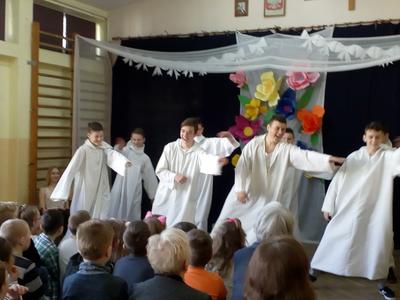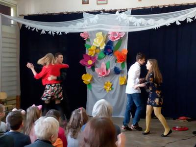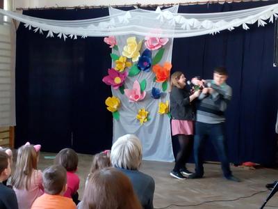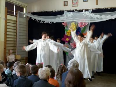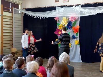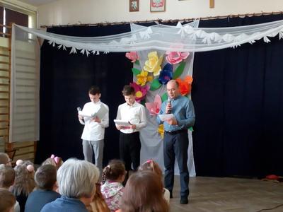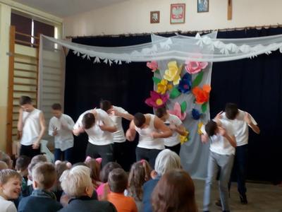 Zapewne wszystkie kobiety obecne na holu głównym Szkoły Podstawowej im. Jana Pawła II w Sątocznie 8 marca były uszczęśliwione, a więc piękne i uśmiechnięte, gdy oglądały żartobliwą, rajską historię swego pochodzenia w wykonaniu ósmoklasistów. Zakończył ją przebojowy taniec chłopców w układzie wymyślonym przez panią Asię. A potem przenieśliśmy się do czasów współczesnych, by obejrzeć małą wariację na temat trudnych związków damsko – męskich. Dowcipna składanka scenek z życia młodej kobiety i jej mężczyzny mogła rozbawić nawet najwybredniejszych. Później nastąpił popis scenicznych umiejętności Julii z klasy IIIG, która prezentowała … kobietę. Dzielnie towarzyszył jej kolega z klasy – Maciek – też w typowej męskiej roli. Był po prostu facetem kobiety … Świetne aktorstwo! Dobra zabawa! Był jeszcze wokalny występ Madzi z klasy ósmej, ciekawostki dotyczące znaczenia imion wszystkich pań pracujących w naszej szkole, miłe życzenia młodszych i starszych panów skierowane do piękniejszej części widowni. Dołączyła się do nich również pani dyrektor Teresa Pupin. Wszystko okraszone piękną muzyką, tulipanami, pomysłowymi prezentami od SU…