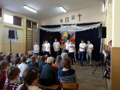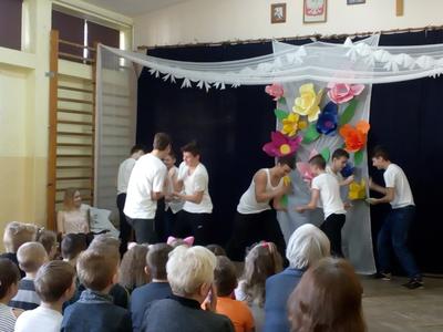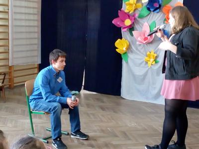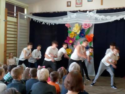 Taki prezent z okazji Dnia Kobiet zgotowali paniom i dziewczynom uczniowie (przede wszystkim chłopcy) najstarszych klas naszej szkoły. Świetne, dowcipne teksty w bardzo dobrym aktorsko wykonaniu, odlotowa muzyka, oryginalne układy taneczne w męskim wykonaniu! Ogólnie – znakomity pomysł i wyśmienity relaks w tym wyjątkowym dniu autorstwa p. Joanny Duryło – opiekunki SU. Kabaretową scenkę przygotowała z uczniami klasy IIIG również p. Lucyna Zińczuk.