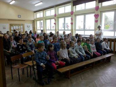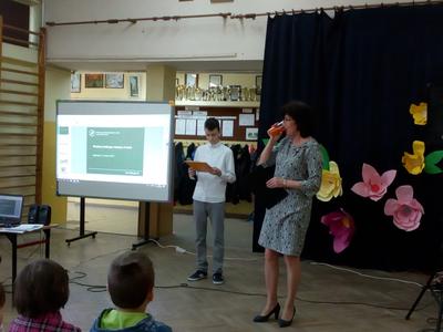 Wcześniej jednak pani dyrektor Teresa Pupin otworzyła XIV Tydzień Ekologiczny, wypijając tradycyjnie szklankę zdrowego soku warzywnego i przedstawiając informacje o konkursach, które odbędą się z tej okazji w naszej szkole. Tradycyjnie również przypomnieliśmy wszystkim o obowiązku dbania o czyste środowisko wokół nas. Trosce o naszą planetę poświęcona była scenka teatralna pt. „ Jak rozweselić Ziemię?” w żywiołowym wykonaniu klasy V pod opieką pani Doroty Wojszko – Kisiel. Następnie nasz zaprzyjaźniony gość, znawca lasu, pani Irena Dziadoń opowiadała pięknie zebranym