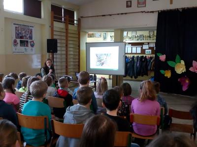 o kwiatach runa leśnego. Prezentacja pani leśnik i sposób prowadzenia narracji jak zwykle przykuwały uwagę uczniów, budziły zainteresowanie i skupienie.