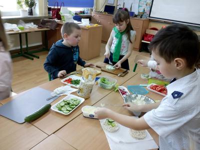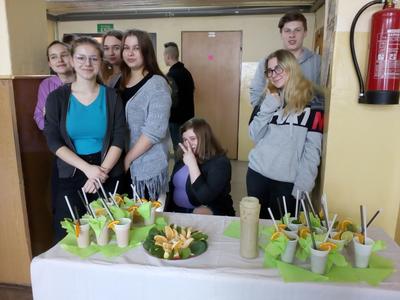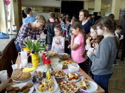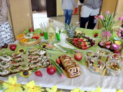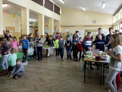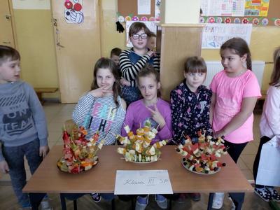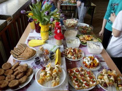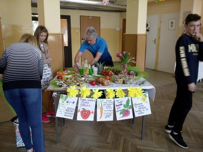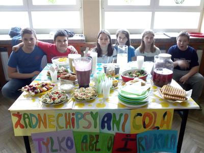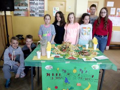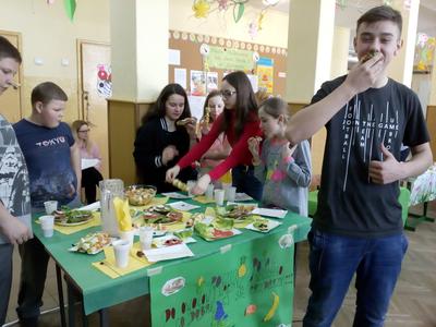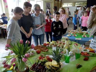 Uczniowie poszczególnych klas – sami, z wychowawcami bądź z pomocą rodziców – przeszli samych siebie. W ramach konkursu „Zdrowo się odżywiamy” wykazali się kreatywnością, pomysłowością, zaangażowaniem w przygotowanie różnorodnych sałatek, kanapek, surówek, soków, przekąsek itd. Zadbali o estetykę podania, o dekorację stoisk, hasła, a przede wszystkim o walory zdrowotne prezentowanych dań. Jury konkursowe było pod wrażeniem uczniowskich pomysłów i orzekło, że wszystkie klasy spisały się celująco. Teraz można było przystąpić do skosztowania przysmaków.