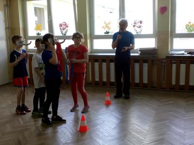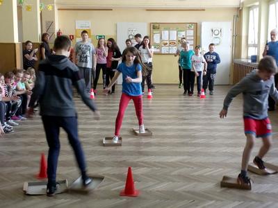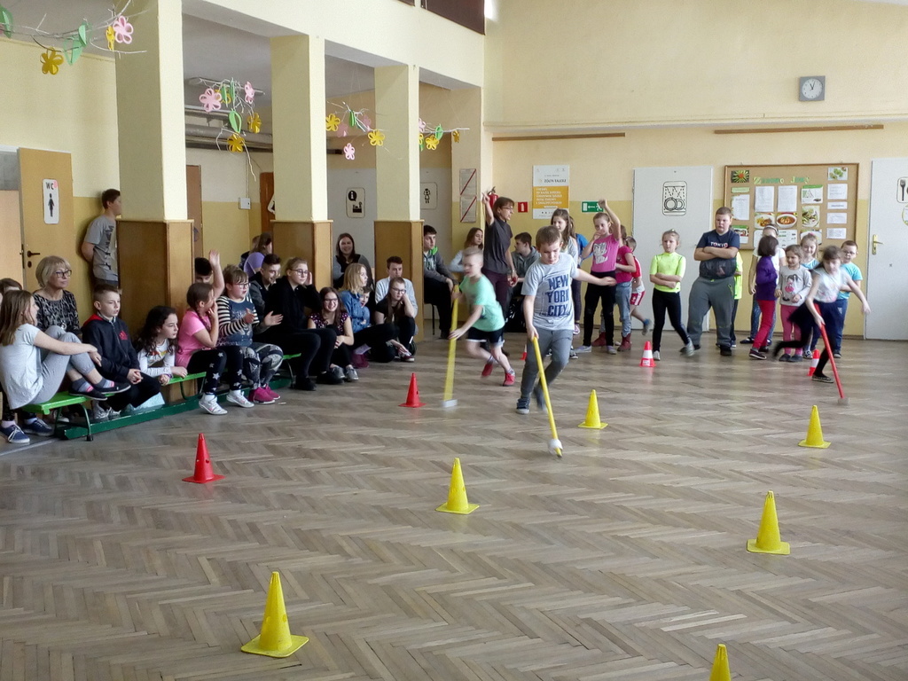 Po przerwie technicznej pan Mirosław Szefer - nauczyciel wychowania fizycznego zaprezentował zebranym piramidę zdrowego odżywiania, a potem emocje rozpalił, tradycyjny podczas Tygodnia Ekologicznego, śmiecioturniej, czyli sportowa rywalizacja klas, w której rekwizyty stanowią … śmieci. Pomysłodawcami zadań do wykonania byli pani Joanna Duryło i pan Mirosław Szefer. Najmłodsi wykonywali więc m. in. bieg ze słomką, slalom hokejowy, rzuty papierową kulą. Klasy IV – VI jeździły na łyżwach