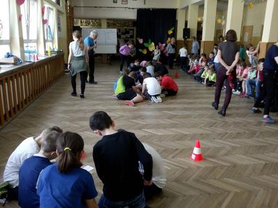 z papieru, odbyły sztafetę z butelką, a najstarsi wykonywali skoki z rolką, biegli z gazetą. Oprócz tego wszyscy musieli wykazać się umiejętnościami manualnymi i … wiedzą ekologiczno – przyrodniczą, budując hasła z rozsypanek wyrazowych czy też odgadując elementy budowy roślin. Zwycięzcy turnieju to klasy: I, VI, VIII SP.