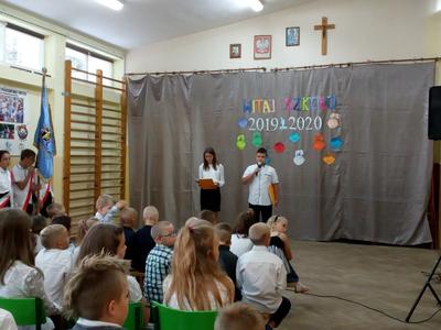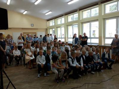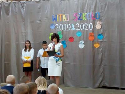 Pani dyrektor Teresa Pupin powitała serdecznie rodziców, uczniów oraz nauczycieli. Szczególnie słowa skierowała do najmłodszych dzieci - przedszkolaków, którzy dopiero rozpoczynają przygodę ze szkołą. Poinformowała także o zmianach w kadrze pedagogicznej naszej placówki. Na zakończenie życzyła uczniom sukcesów w nauce.
