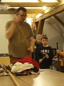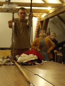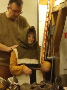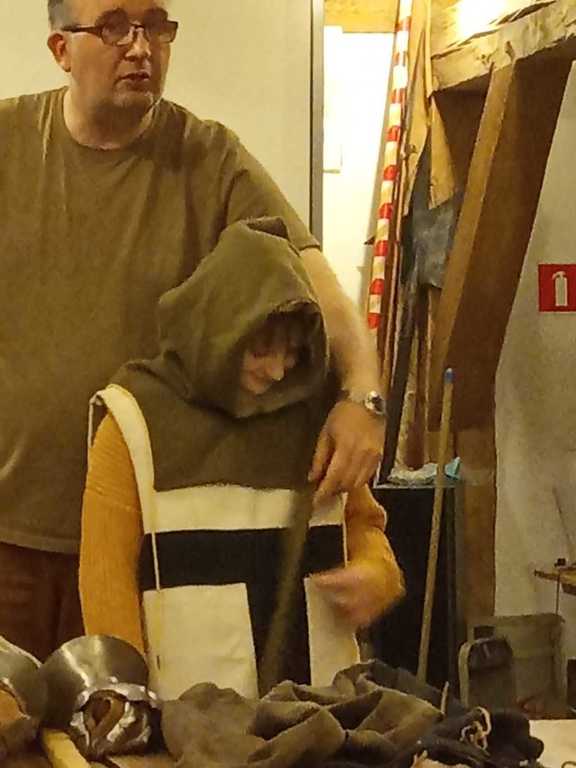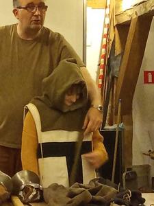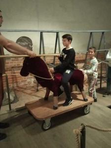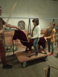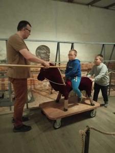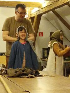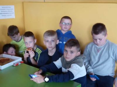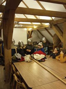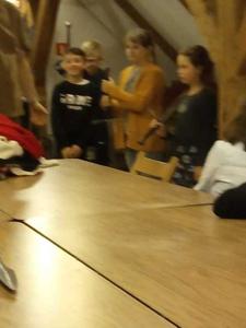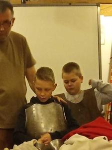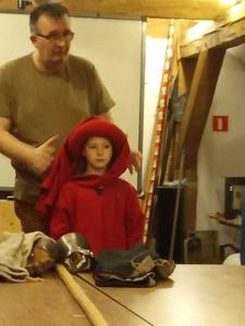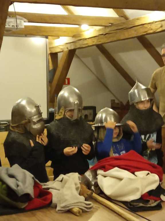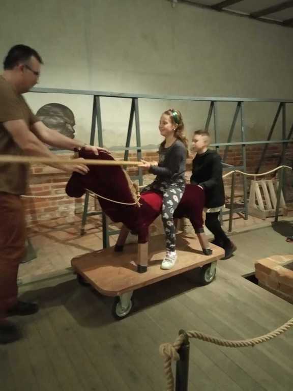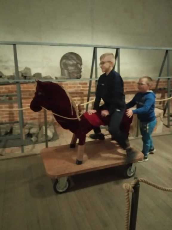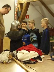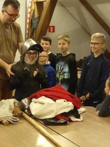 Dawno, dawno temu… Nie, nie. Całkiem niedawno a dokładnie 4 października 2019 roku uczniowie klasy V wraz z wychowawczynią i dwiema wspaniałymi mamami wyruszyli pociągiem intercity (równie szybkim jak średniowieczne rumaki) do ziemi olsztyńskiej. Cel główny był jeden. Dostać się do Zamku Kapituły Warmińskiej i zdobyć zaszczytny tytuł w „Turnieju rycerskim”. Zwartą drużyną wkroczyliśmy na teren zamku. Byliśmy przed czasem, co dobrze o nas świadczy. Mogliśmy posilić się przed walką i obejrzeć dokładnie teren. Wnętrze zamku było mroczne i chłodne. Odwaga nas jednak nie opuszczała i już po chwili znaleźliśmy w królestwie pana Sebastiana Mierzyńskiego, który doskonale przygotował nas do turnieju. Było przymierzanie rycerskiej zbroi (chłopcy poczuli jaki to ciężar!) i średniowiecznego odzienia (dziewczynki bez problemu odnalazły się w tej roli, choć nie ma wątpliwości że obecne sukienki są bardziej urokliwe). Poznaliśmy różne rodzaje broni średniowiecznej, nakrycia głowy chroniące podczas walki. Bądź co bądź – jak podkreślił pan Sebastian – mężczyzna walczył dla kobiety. Nasi młodzi mężczyźni mogli zatem wykazać się przed dziewczętami swoimi umiejętnościami w strzelaniu z łuku, kuszy, rzucając podkową a przede wszystkim dosiadając rumaka, by poczuć zapał rycerskiego zwycięstwa. Dziewczyny też nie chciały być gorsze i trochę naciągnęły średniowieczne zwyczaje i również stanęły do walki. Klasa V pokazała klasę. W grupie jest siła! Turniej wygrany. Na koniec jak przystało na wojowników powracających z wyprawy zabraliśmy ze sobą łupy - pamiątki w postaci zdjęć, pocztówek, kubków, figurek.