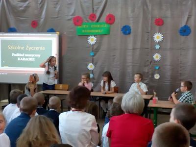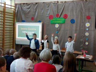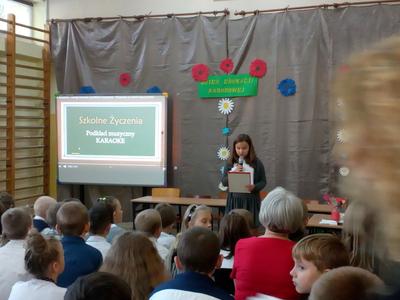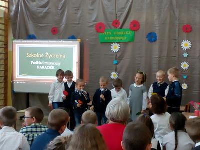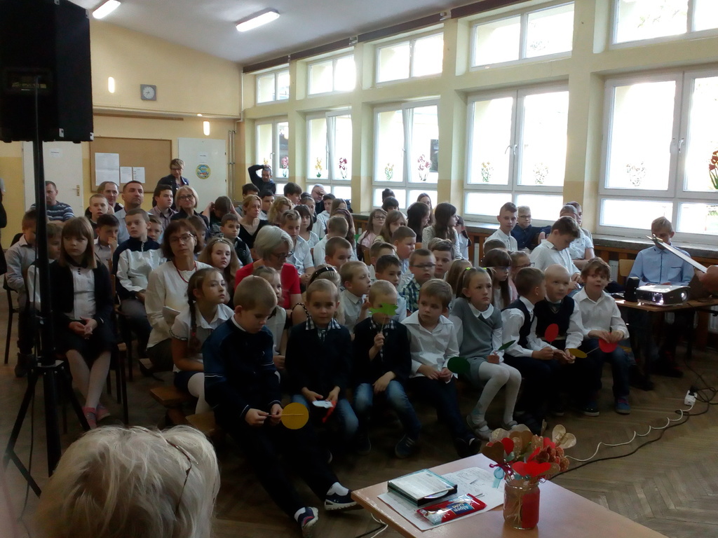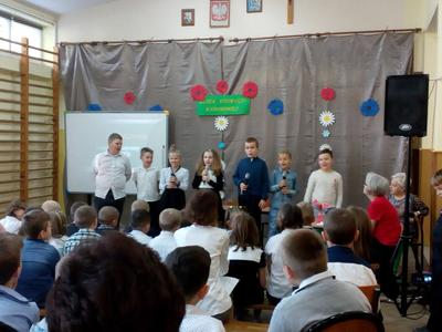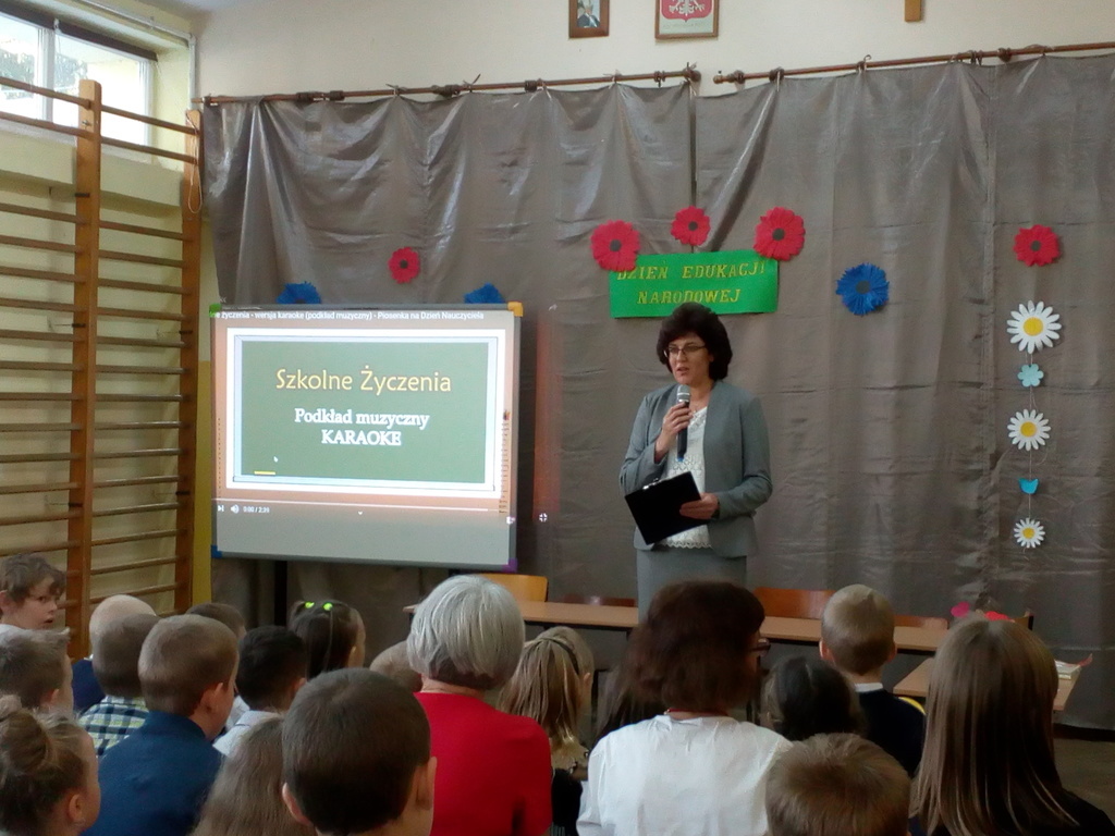 Zanim jednak rozpoczęła się część artystyczna Pani Dyrektor Teresa Pupin złożyła wszystkim pracownikom szkoły najserdeczniejsze życzenia z okazji ich święta. Następnie najmłodsi uczniowie po czujnym okiem wychowawców: Pani Doroty Sańko, Doroty Żolik i Elżbiety Szefer zaprezentowali swoje talenty wokalno – recytatorskie przed społecznością szkolną. Występy były wspaniałe, co potwiedziły ogromne brawa. Drobne upomniki dla pracowników szkoły przgotował Samorząd Uczniowski. Z roku na rok zaskakują pomysłowością. A wszystko z głębi serca płynęło... Tak jak prezent przygotowany przez grupę socjoterapeutyczną. Ogromne zaskoczenie i ogromne wzruszenie... Prezent niezwykły... „Song na dzień teacherów” to utwór, który popłynął z głośników pod koniec uroczystości. Złapał za serce... Dodał wiary....Dziękujemy.