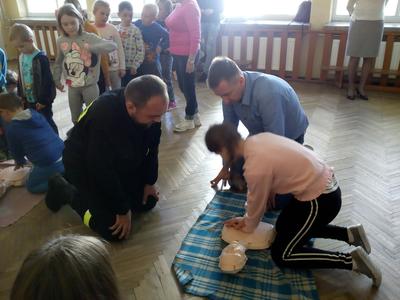 Punktualnie o godzinie 12:00 w całej Polsce przez pół godziny trwała próba pobicia rekordu. My także, zwarci i gotowi czekaliśmy na sygnał, po którym rozpoczeliśmy prowadzenie resuscytacji krążeniowo – oddechowej na czterech fantomach. Działania prowadzili uczniowie, nauczyciele oraz pracownicy administracji i obsługi. Do akcji przyłączyli się także strażacy OSP w Korszach, co było świetną okazją do „otworzenia worka” z pytaniami i przypatrzenia się jak pierwszej pomocy udzielają zawodowcy.