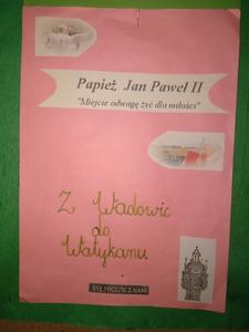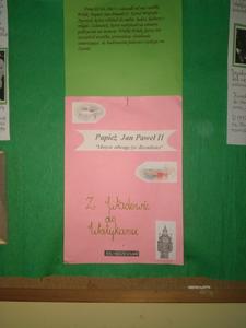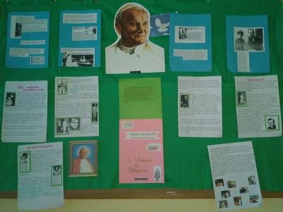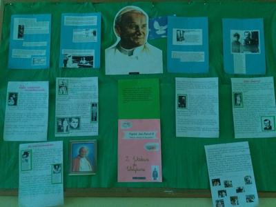 16 października obchodziliśmy 41 rocznicę wyboru Korola Wojtyły na papieża. Jan Paweł II często powtarzał: „Wymagajcie od siebie choćby inni od was nie wymagali”. Praca naszej uczennicy jest tego najlepszym przykładem. Amelia Stróg z klasy IV samodzielnie przygotowała gazetkę na temat patrona naszej szkoły -Jana Pawła II. Wykonane przez Amelkę materiały zdobią tablicę w świetlicy szkolnej. Brawo, Amelia.
