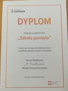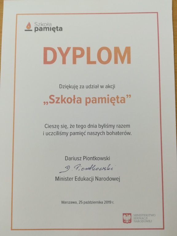 Nasza szkoła otrzymała podziękowanie od Ministra Edukacji Narodowej Dariusza Piontkowskiego za włączenie się do akcji "Szkoła pamięta", która miała swój finał 25 października br. Celem inicjatywy było zwrócenie uwagi młodych ludzi na potrzebę pielęgnowania pamięci o bohaterach naszej wolności, szczególnie tych, którzy są związani z historią danego regionu.