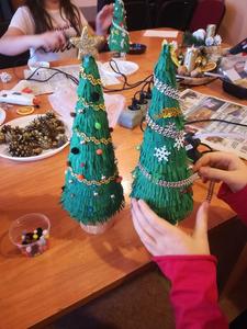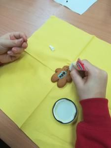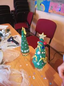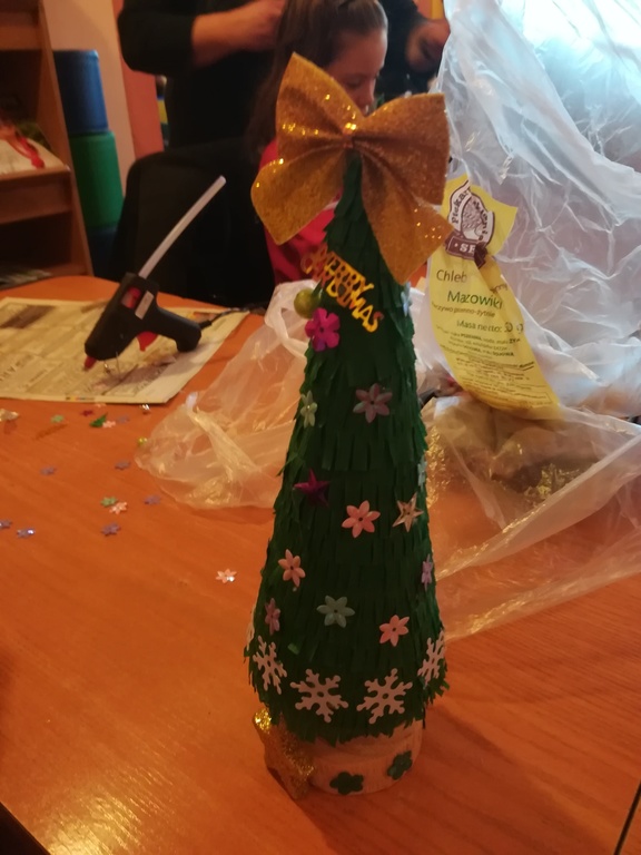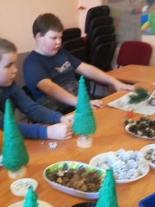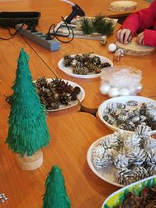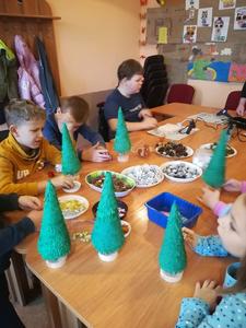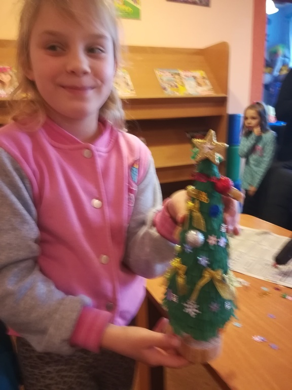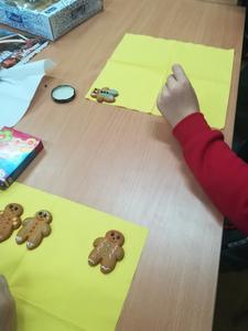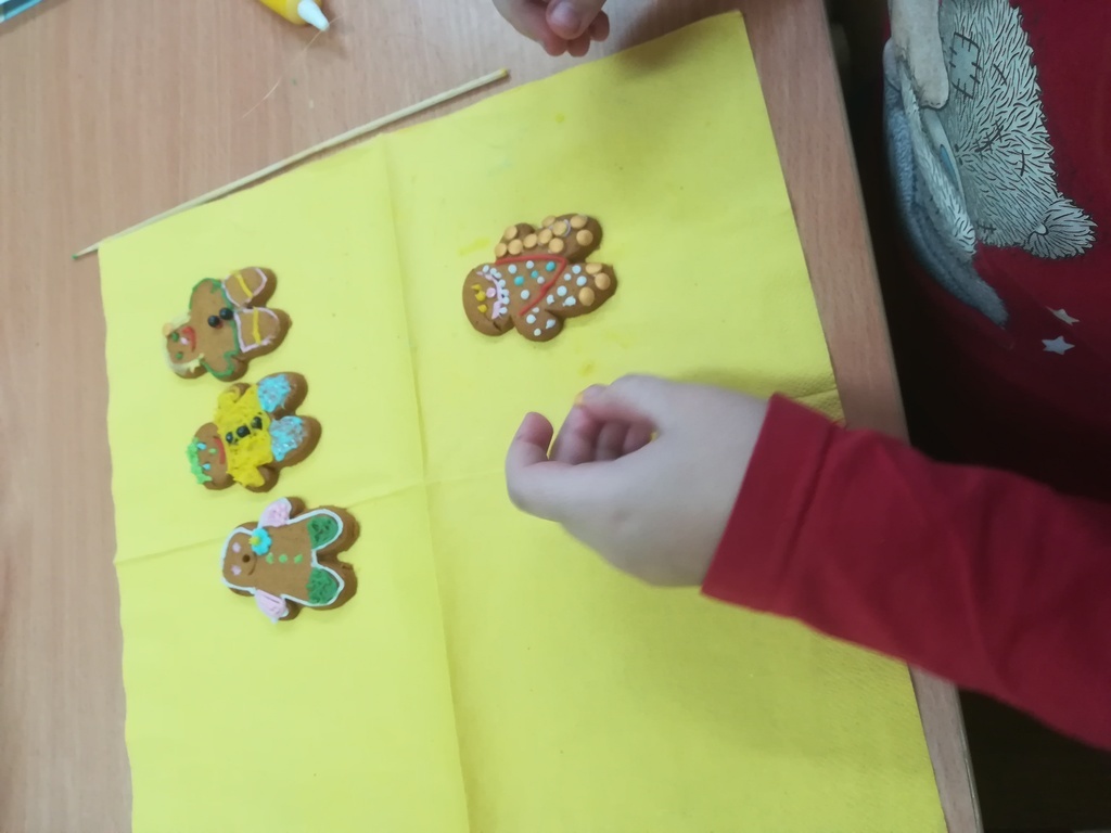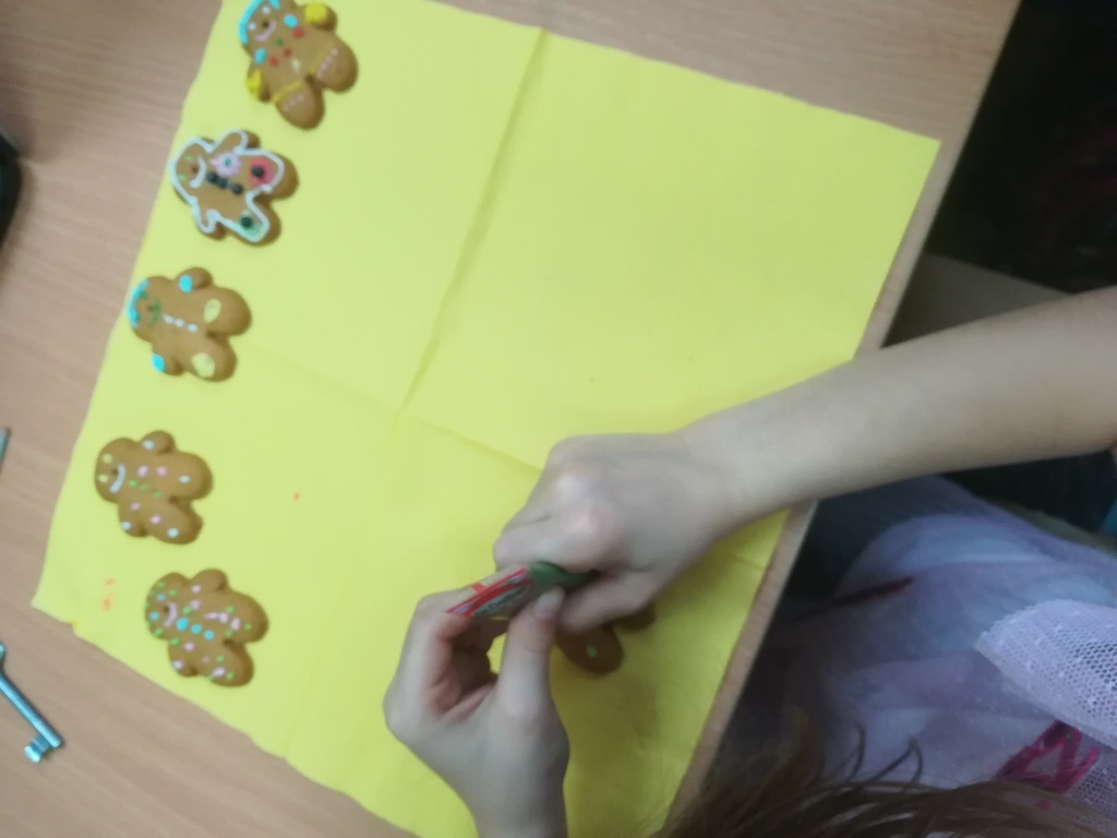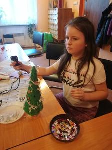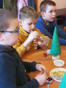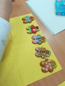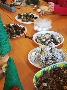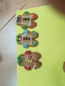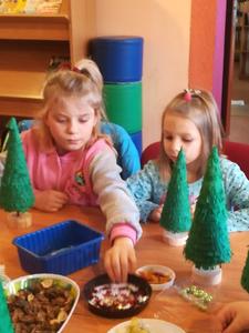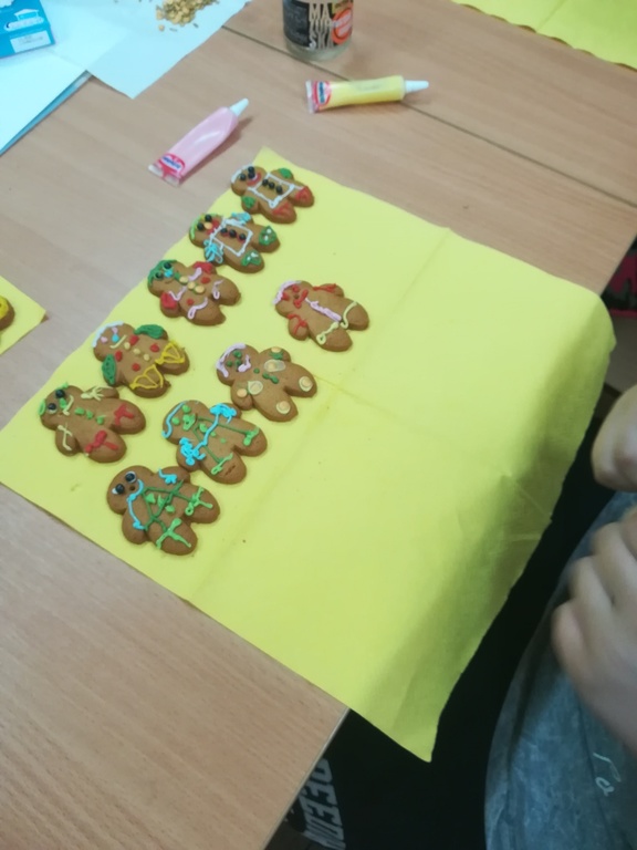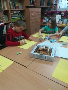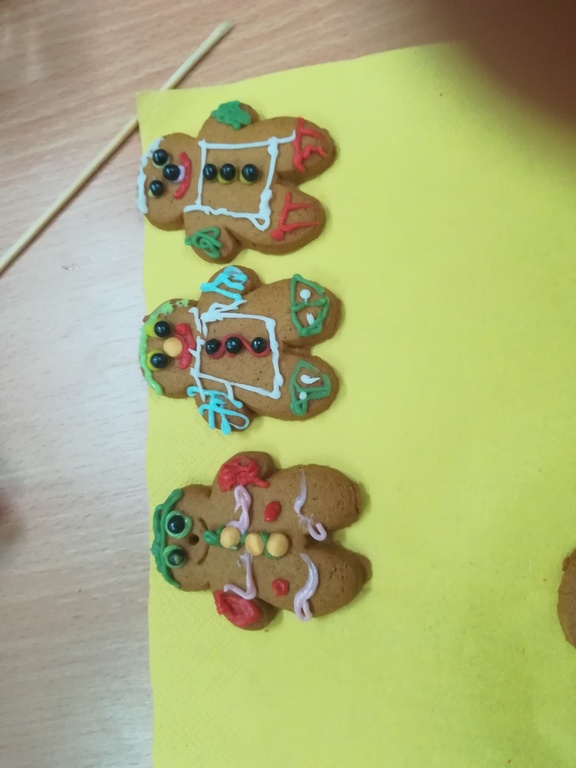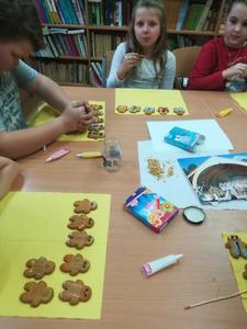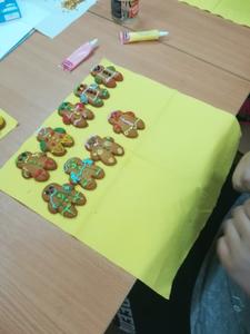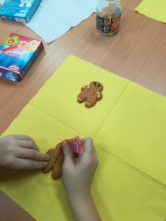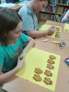 Aby tradycji przedświątecznej stało się zadość także i w tym roku dzieci ze świetlicy szkolnej zostały zaproszone przez panią Mirkę na warsztaty, podczas których wykonywały stroiki świąteczne. Biblioteka publiczna zamieniła się w pracownię przedświąteczną. Spod rąk dzieci wychodziły przepiękne dzieła. Pani Mirka, jak zawsze zadbała, by uczniom nie brakowało materiałów do tworzenia. Szyszki, orzechy, choineczki, kokardki, bombki, groszki, gwiazdki.... Było w czym wybierać, przebierać... Uczta dla kreatywnych! Dzieci wracały szczęśliwe, pełne dobrych emocji i uśmiechu. Na zakończenie otrzymaliśmy jeszcze słodki podarunek od pani Mirki. Opakowanie pachnących pierników. Już następnego dnia dekorowaliśmy je nie tylko słodkim lukrem ale przede wszystkim fantazją. Pani Mirko, dziękujemy.