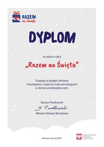 Nasza szkoła otrzymała podziękowanie od Ministra Edukacji Narodowej Dariusza Piontkowskiego za włączenie się do akcji "Razem na Święta"