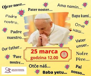 Papież Franciszek zwraca się do wszystkich chrześcijan całego świata z prośbą, by 25 marca (czyli DZIŚ!!!) o godz 12.00 (w samo południe!) zatrzymać się na chwilę i odmówić "OJCZE NASZ", prosząc o ustanie pandemii. Modlitwę znaną przez wszystkich.