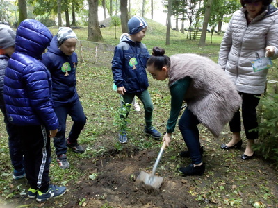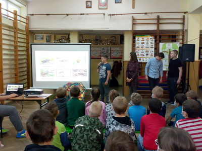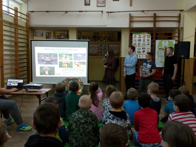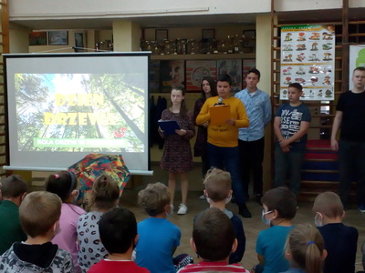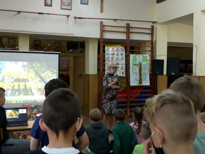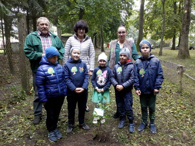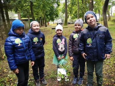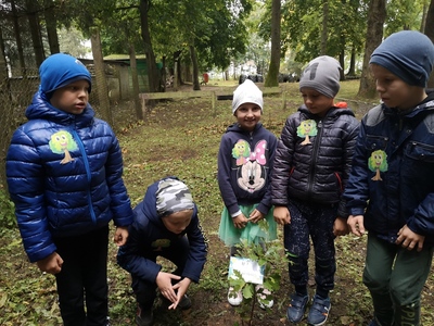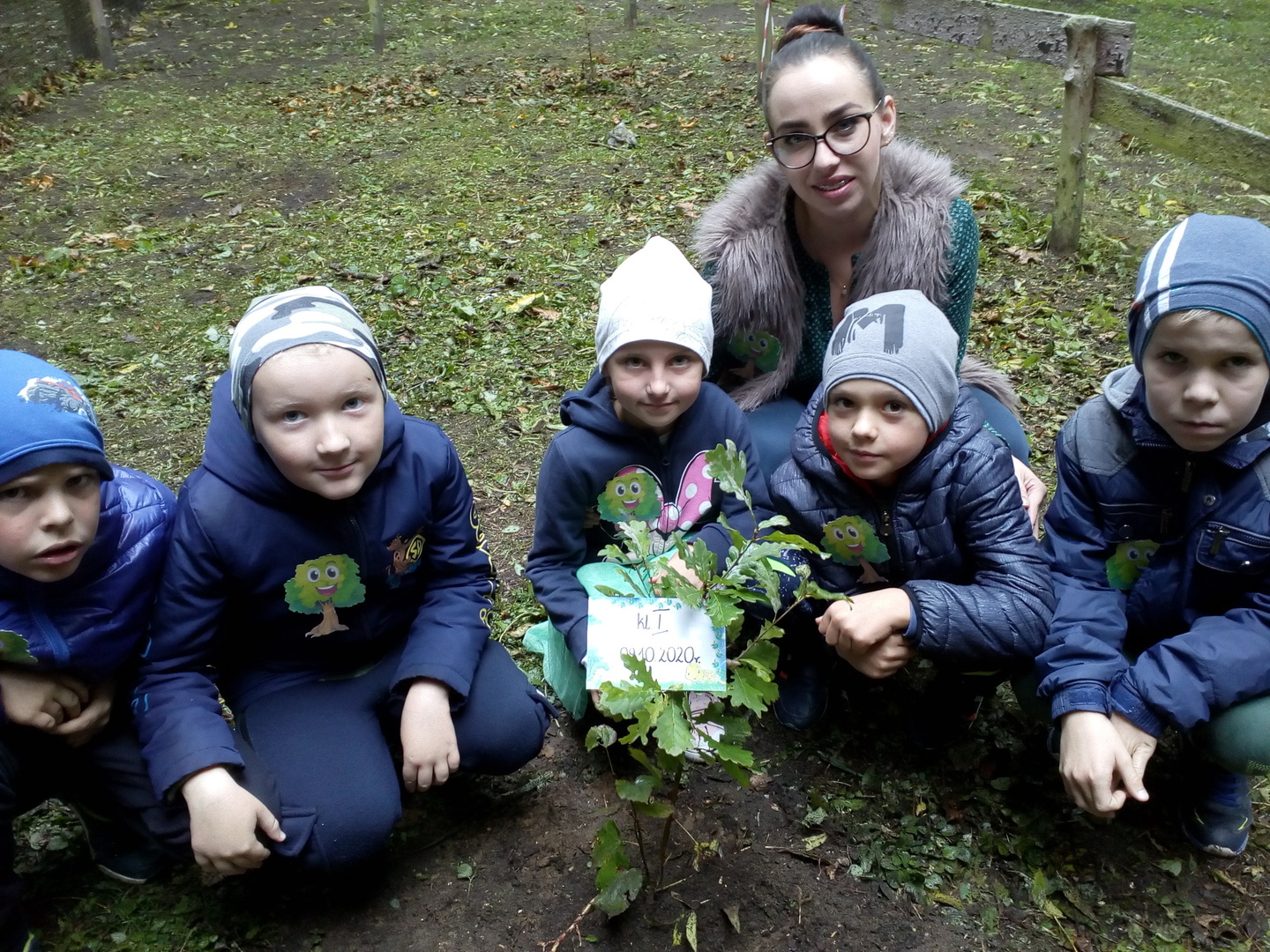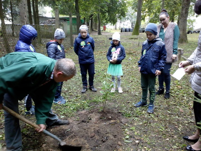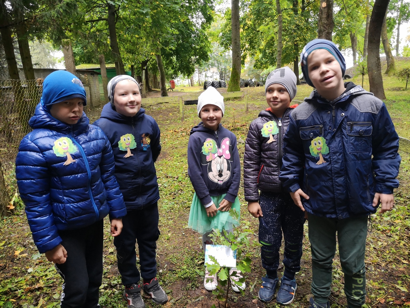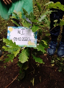 Uczniowie naszej szkoły także przyłączyli się do akcji. Dzięki klasie VII, która wraz z wychowawczynią, panią Krystyną Zajdel przygotowała kilka istotnych faktów na temat lasu i jego bogactw, mogliśmy poszerzyć naszą wiedzę i przypomnieć sobie jak ważne są drzewa wokół nas. Bogactwo, które dają człowiekowi jest ogromne. Starsi uczniowie już o tym wiedzą, młodsi poznają i uczą się szacunku do przyrody. Z tego oto powodu klasa I otrzymała specjalną misję. Zasadzenie drzewa na terenie szkoły. Jak przygotowała się do wypełnienia tego odpowiedzialnego zadania? Otóż najpierw pod czujnym okiem wychowawczyni, pani Emilii Wójtowicz wykonała pracę plastyczną „Jesienne drzewo”. Następnie wzięła udział w apelu. Dzieci z zaciekawieniem słuchały i oglądały prezentację przygotowaną przez klasę VII. Uczniowie, świadomi odpowiedzialności za stan środowiska otrzymali specjalne nalepki uśmiechniętego drzewka. Następnie Pierwszaki z zaangażowaniem i dumą posadziły swój własny dąb, na którym została zawieszona tabliczka z datą. Drzewo będzie rosło razem z nimi.
