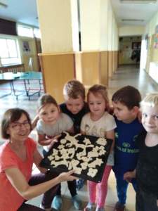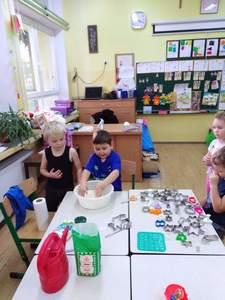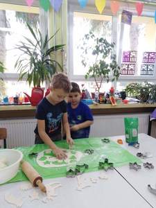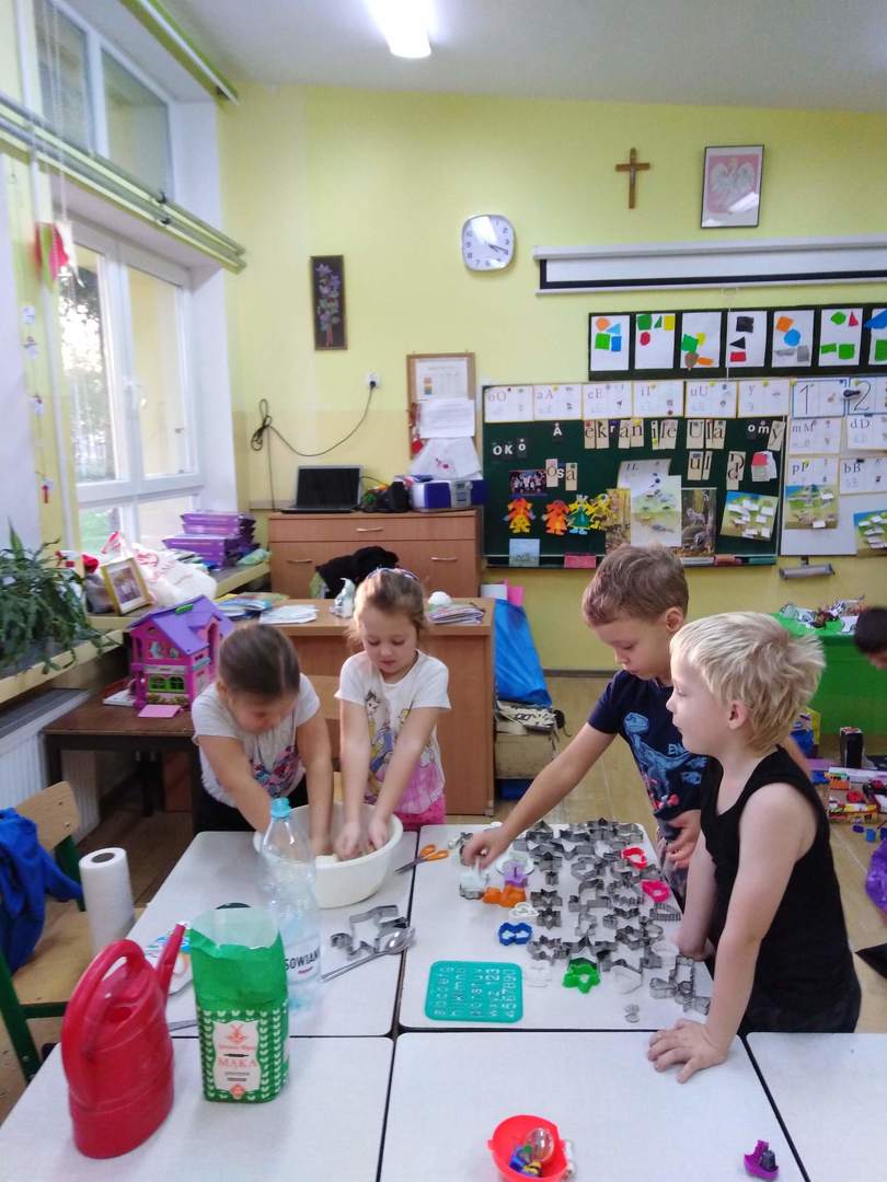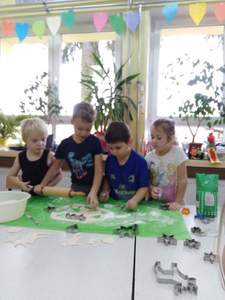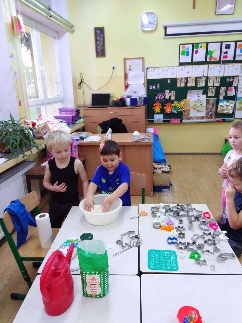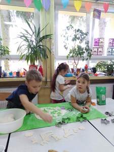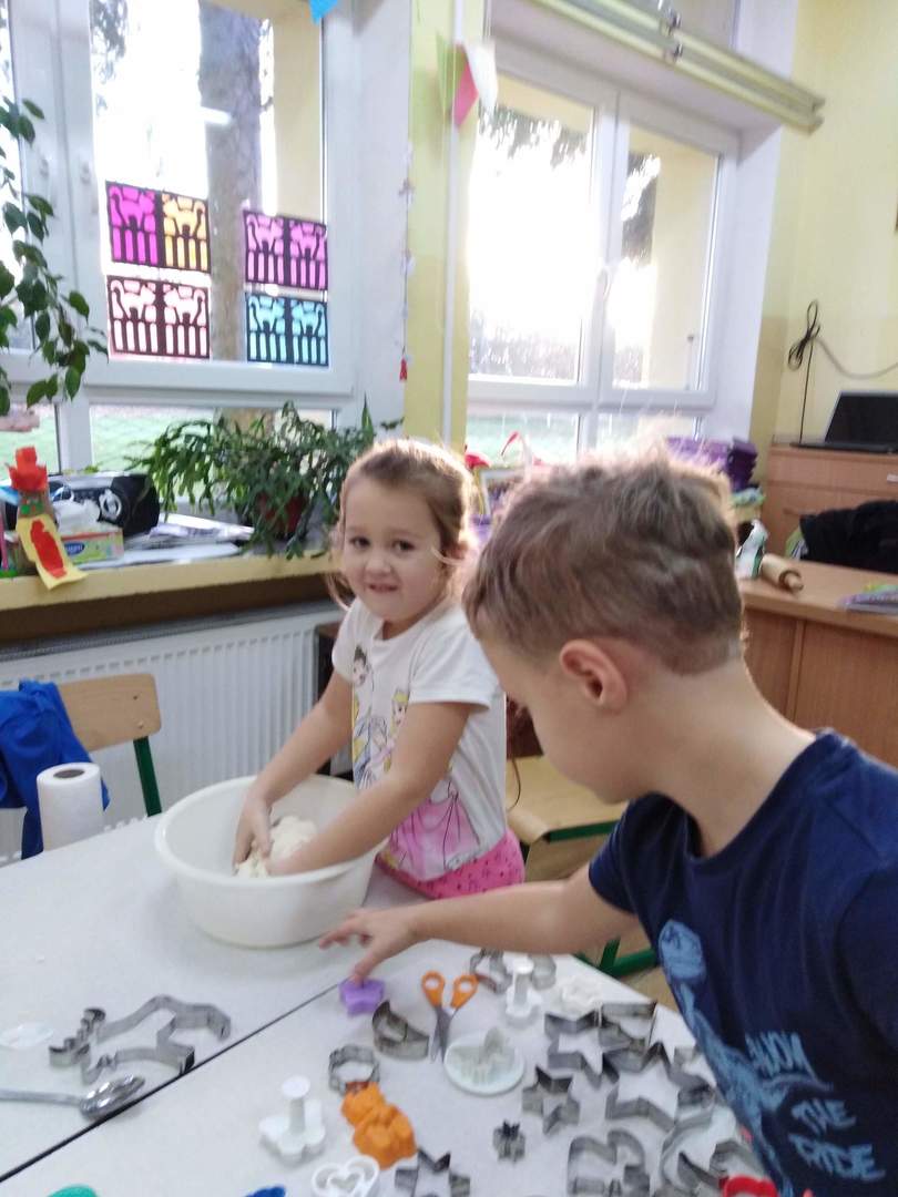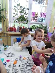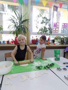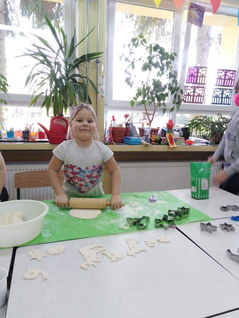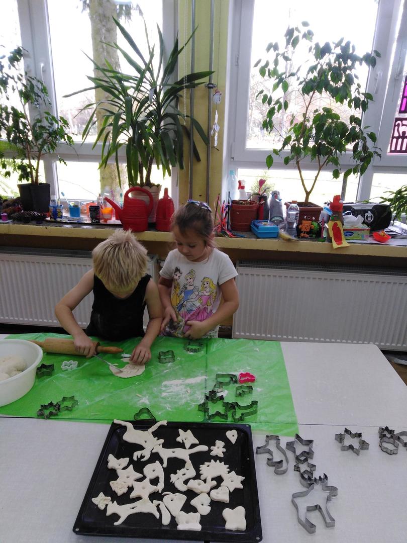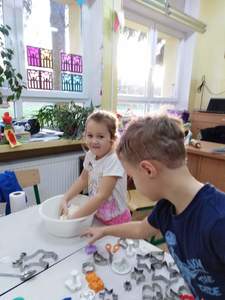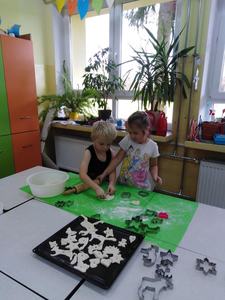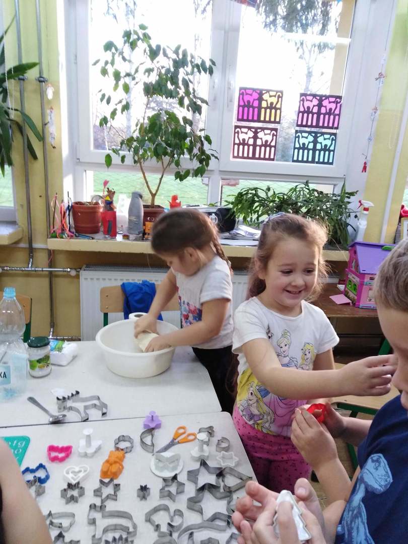 Przedszkolaki przygotowują się do zbliżających się Świąt Bożego Narodzenia. W czasie zajęć lepiły z masy solnej ozdoby choinkowe, wyciskały z foremek różne kształty, a potem kolorowały je farbkami.