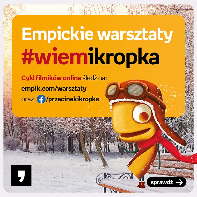 Wystarczy wejść na empik.com/warsztaty https://empik.emsecure.net/optiext/optiextension.dll?ID=0wx0sSKGtLKVGAwtJajpMEIiFkLnJ0ptI8dnjIdm7qBz%2Bsne8EgYMkheglt2tWX_Tzte6NoEzlwtsMZND%2BqSxaI9UV2SU lub fb/Przecinek i Kropka https://empik.emsecure.net/optiext/optiextension.dll?ID=1xw1sC4ph%2B9Z_YVep4dEGq0Cl3aQr7Ivj486exK1yIz_kT0L8IBa_J8Dwn9j093hkUkGg1Zc6c3KnUqrluOkekmsLrPn_, gdzie na dzieci i rodziców czeka ponad 70 dotychczas zrealizowanych warsztatów, zupełnie za darmo! A już od 28 grudnia startujemy z nową, zimową odsłoną serii #wiemikropka w ww. kanałach.