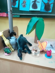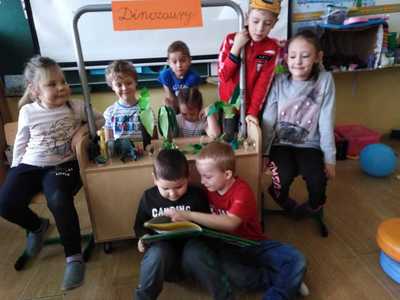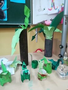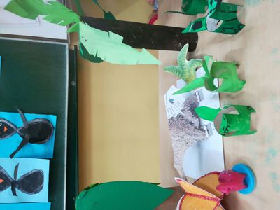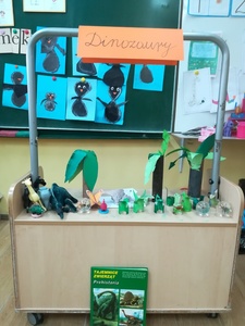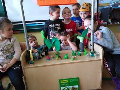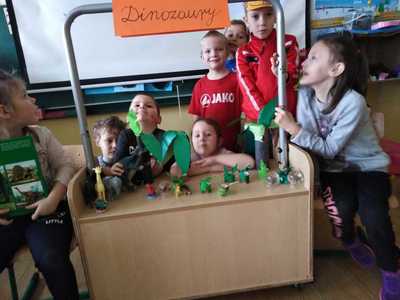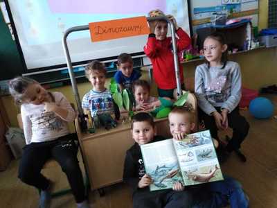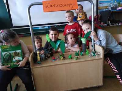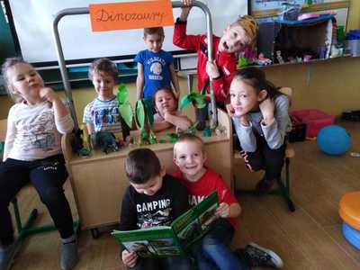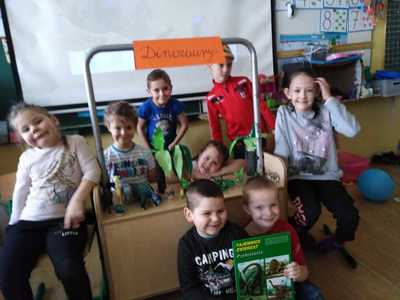 W przedszkolu zrobiło się groźno...A to za sprawą dinozaurów, które postanowiły opowiedzieć najmłodszym swoją historię. Oczywiście nie osobiście, ale z pomocą pani Doroty Sańko, wychowawczyni przedszkolaków, która w ciekawy sposób przedstawiła wiele interesujących informacji o tych prehistorycznych zwierzętach. Dzieci miały też okazję obejrzenia filmu o dinozaurach, który wzbudził ogromne zaciekawienie. Finiszem przygody z tymi niezwykłymi zwierzętami była praca plastyczna pt.”Dinozaury w dżungli”. Maluchy świetnie sprostały zadaniu, tworząc dinozaurowy świat, do którego przeniosły się wraz ze swoją panią.