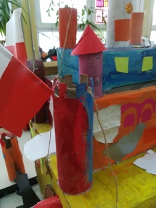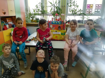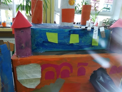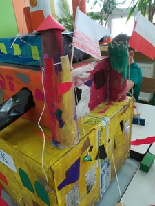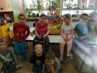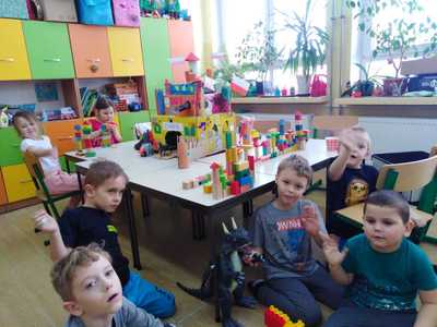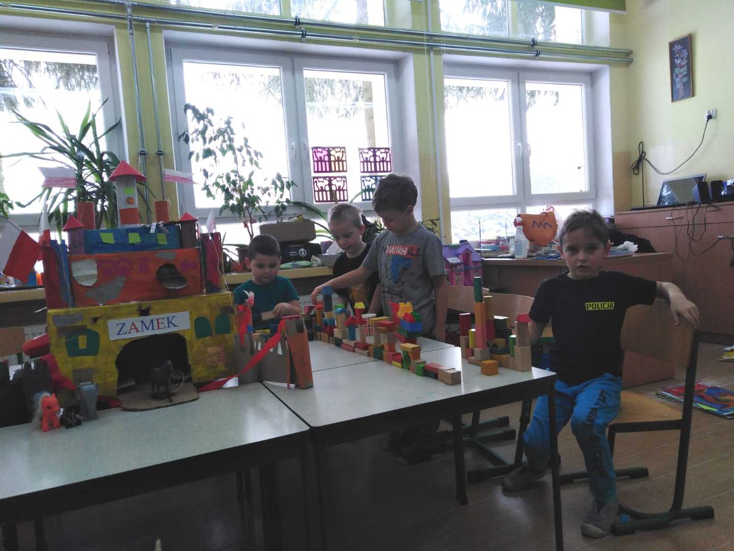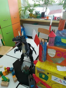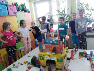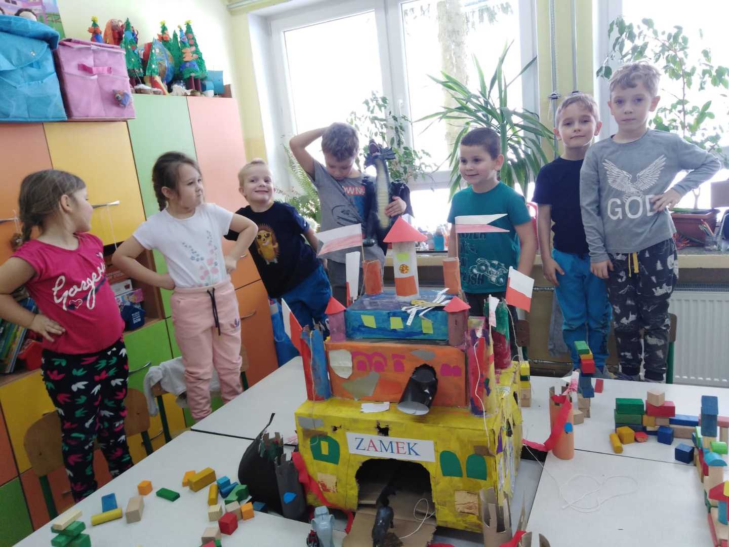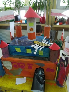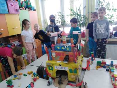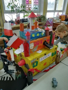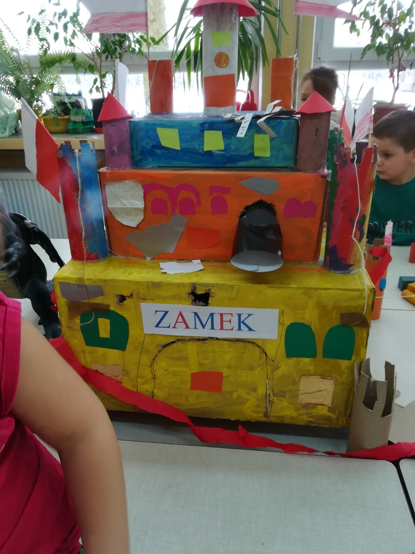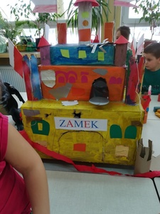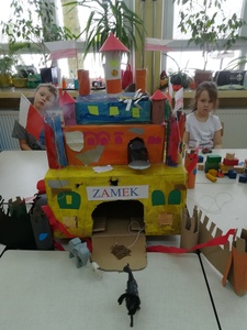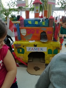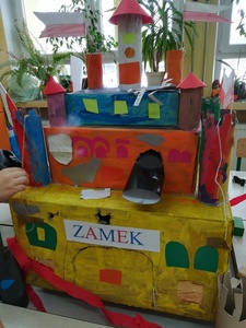 Ponownie zaglądamy do przedszkolaków...Przed naszymi oczami staje potężna budowla. Co to takiego? Zanim maluchy zdradziły co kryje się w pudełkowej konstrukcji, opowiedziały jak tworzyły swoje wspólne „dzieło”. Pomysł nadała pani Dorota Sańko, natomiast najlepsza część zabawy należała do przedszkolaków. Malowanie, wycinanie, przyklejanie, lepienie plastelinowych rycerzy...Pojawił się także zwodzony most, sznurkowe pajęczyny, ogromny pająk i piękny mur zbudowany z klocków, który strzegł dostępu do… No właśnie! Ten wspaniały projekt, który zajął maluchom kilka dni to ZAMEK. Kiedy konstrukcja została skończona, pani Dorota Sańko umieściła na niej napis „ZAMEK”. Dzieci po kolei literowały słowo, tym samym ćwicząc czytanie.
