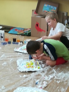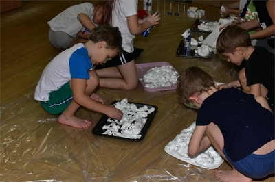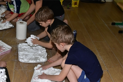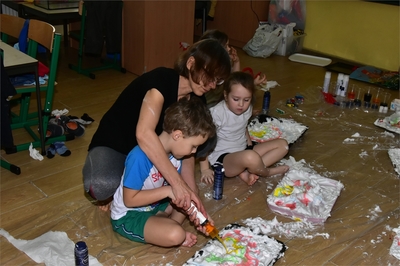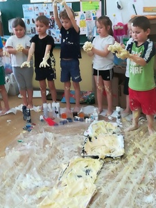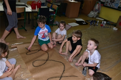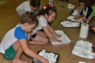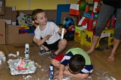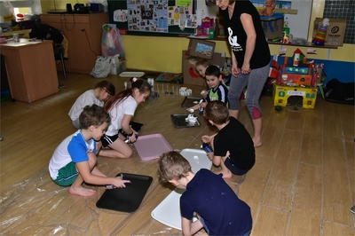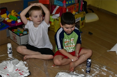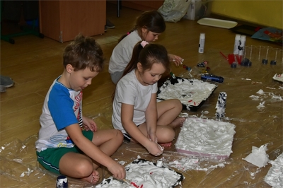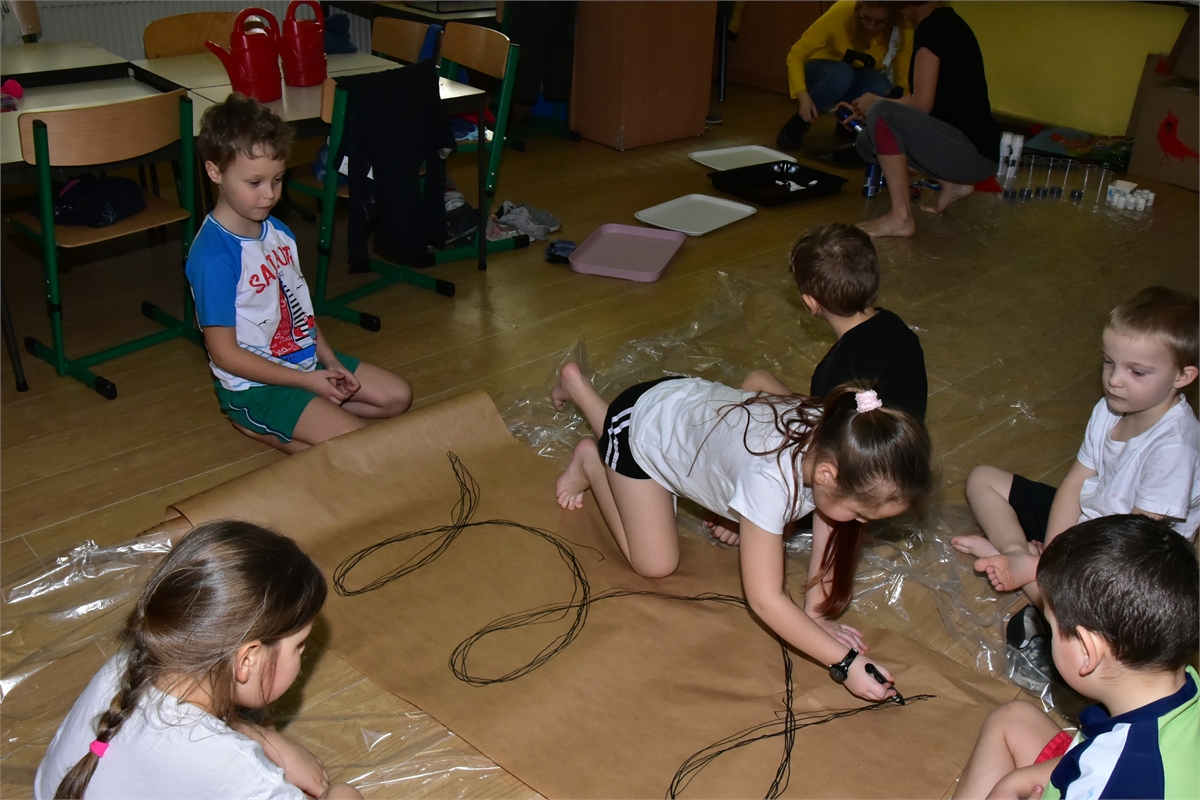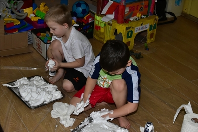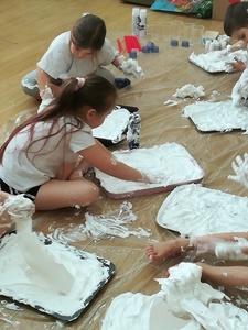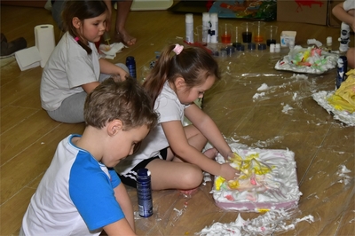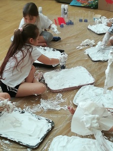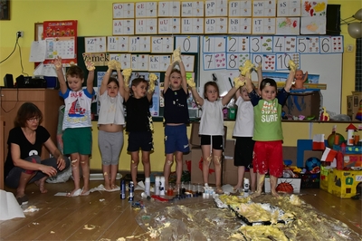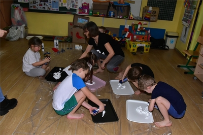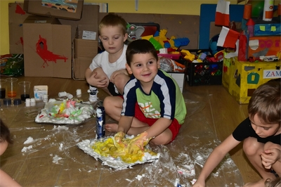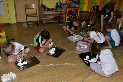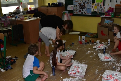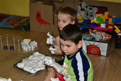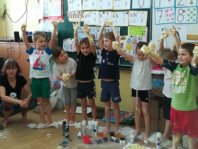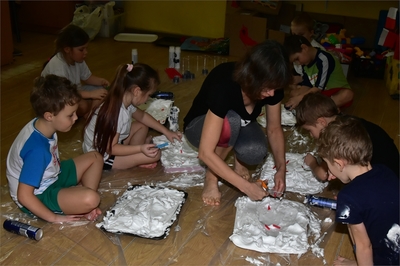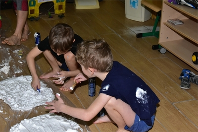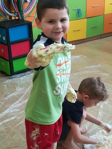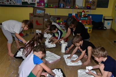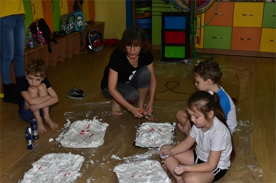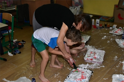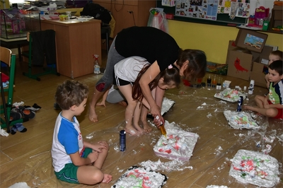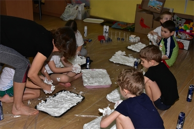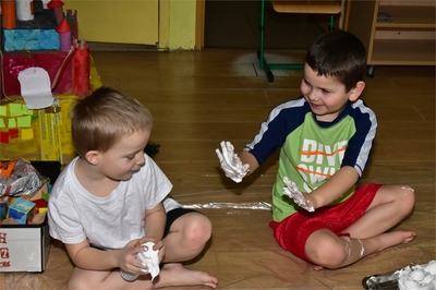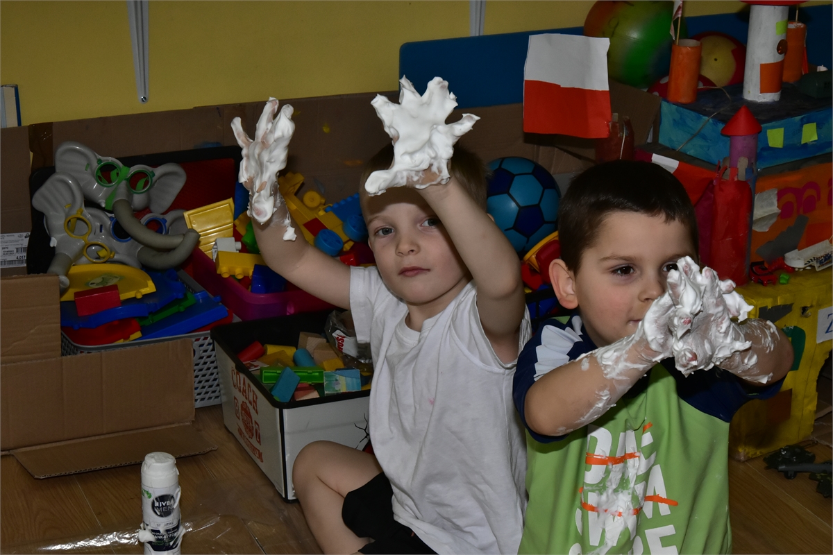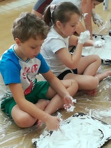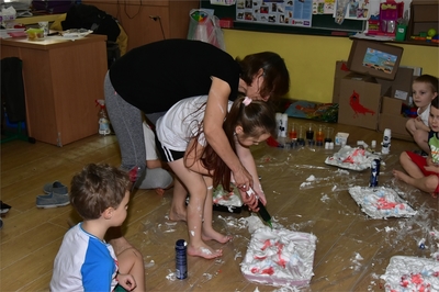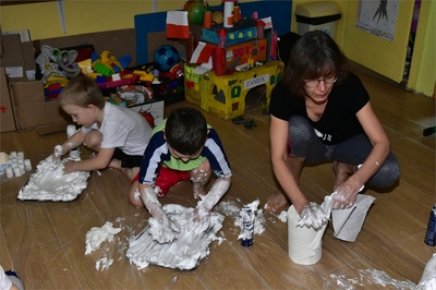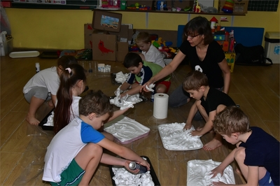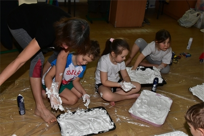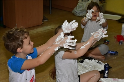 23 lutego odbyły się w oddziale przedszkolnym zajęcia pod hasłem "Białe szaleństwo - zabawy stymulujące rozwój rąk". Zabawy z piankami do golenia to znakomita stymulacja czuciowa rąk. Dzieci tworzyły ciekawe kształty, rysowały palcami na tacach rozsmarowaną pianką odwzorowując szlaczki i litery. Były to ćwiczenia grafomotoryczne przygotowujące do nauki pisania. Podczas zabawy przedszkolaki poznawały wielozmysłowo kształty liter, rysując palcem odbierały dodatkowe bodźce czuciowe, natomiast zabawa w ratowników, którzy ratują ludziki z lawiny śnieżnej była pretekstem do doskonalenia koordynacji wzrokowo-ruchowej i chwytu. Bawiły się także kolorami tęczy na "śniegu" i utrwalały nazwy kolorów, a także urządziły rajd samochodowy. Ta "śnieżna" zabawa była świetną okazją do ćwiczenia wyobraźni i kreatywności. Natomiast sama pianka wspaniała, puszysta, delikatna, aż nie chciało się wyciągać rąk... Nie byłoby jednak tej kreatywnej zabawy bez rodziców, którzy po raz kolejny pokazali jak ważna jest dla nich edukacja dzieci. Wszystkie potrzebne materiały do zajęć zostały zakupione właśnie przez nich. I tu dziękujemy rodzicom za ich otwarte serce, wszelką pomoc i zawsze gotowość do współpracy.